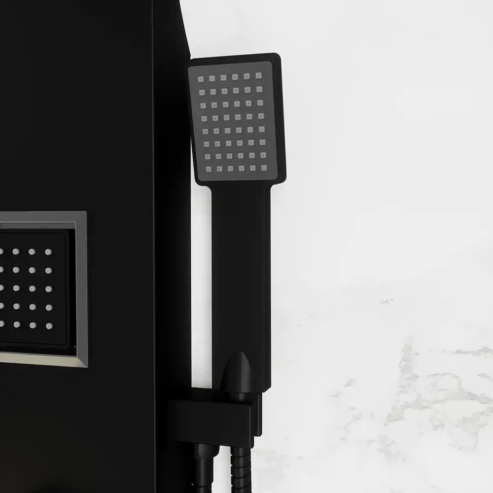 La sua struttura è composta interamente di alluminio con finitura nera opaca. Soffione, doccetta e getti idromassaggio sono in ABS con forma squadrata, mentre gli ugelli per il flusso d'acqua sono in silicone anti-calcare per una pulizia facile e veloce. Il flessibile incluso in acciaio inox è fornito nella misura 150cm.