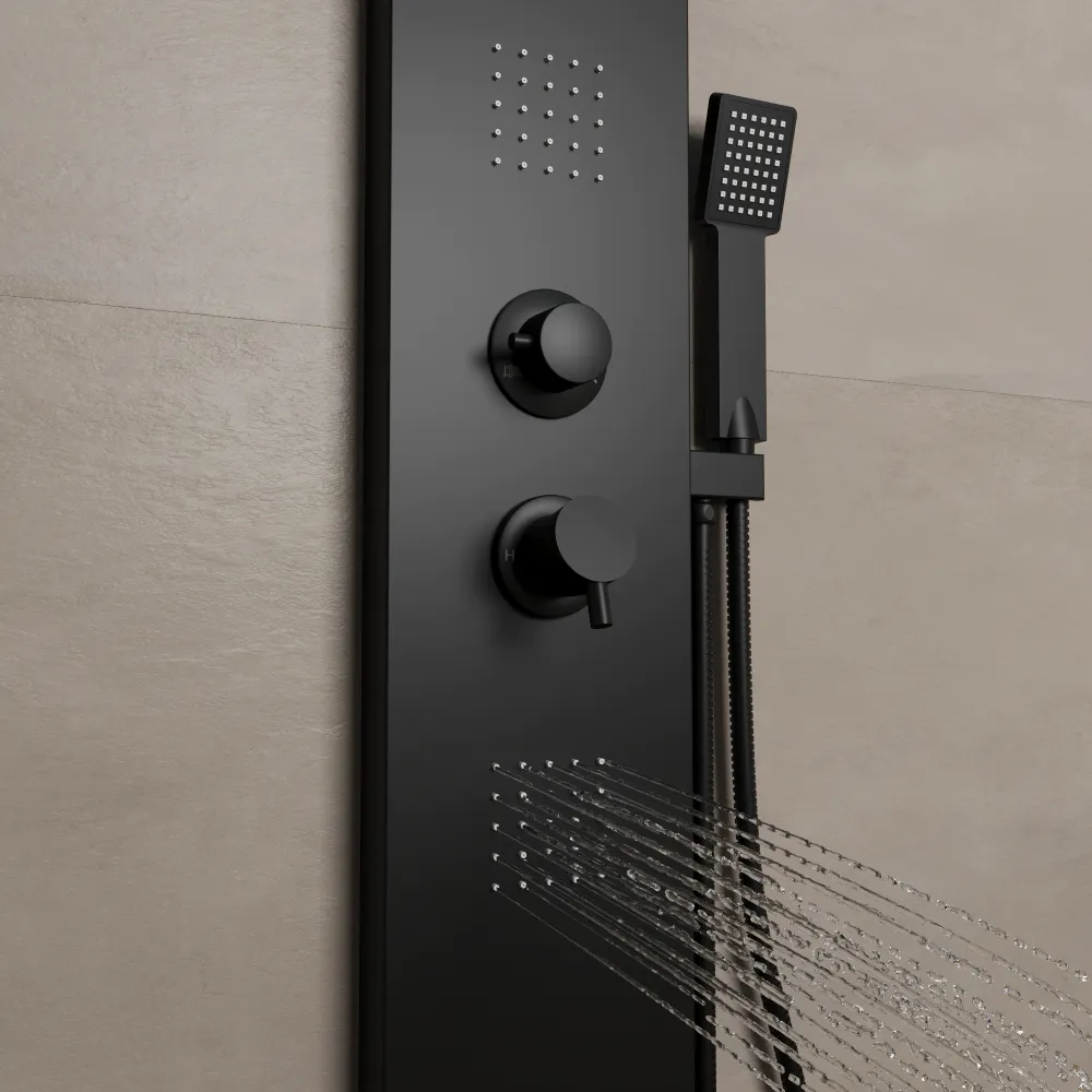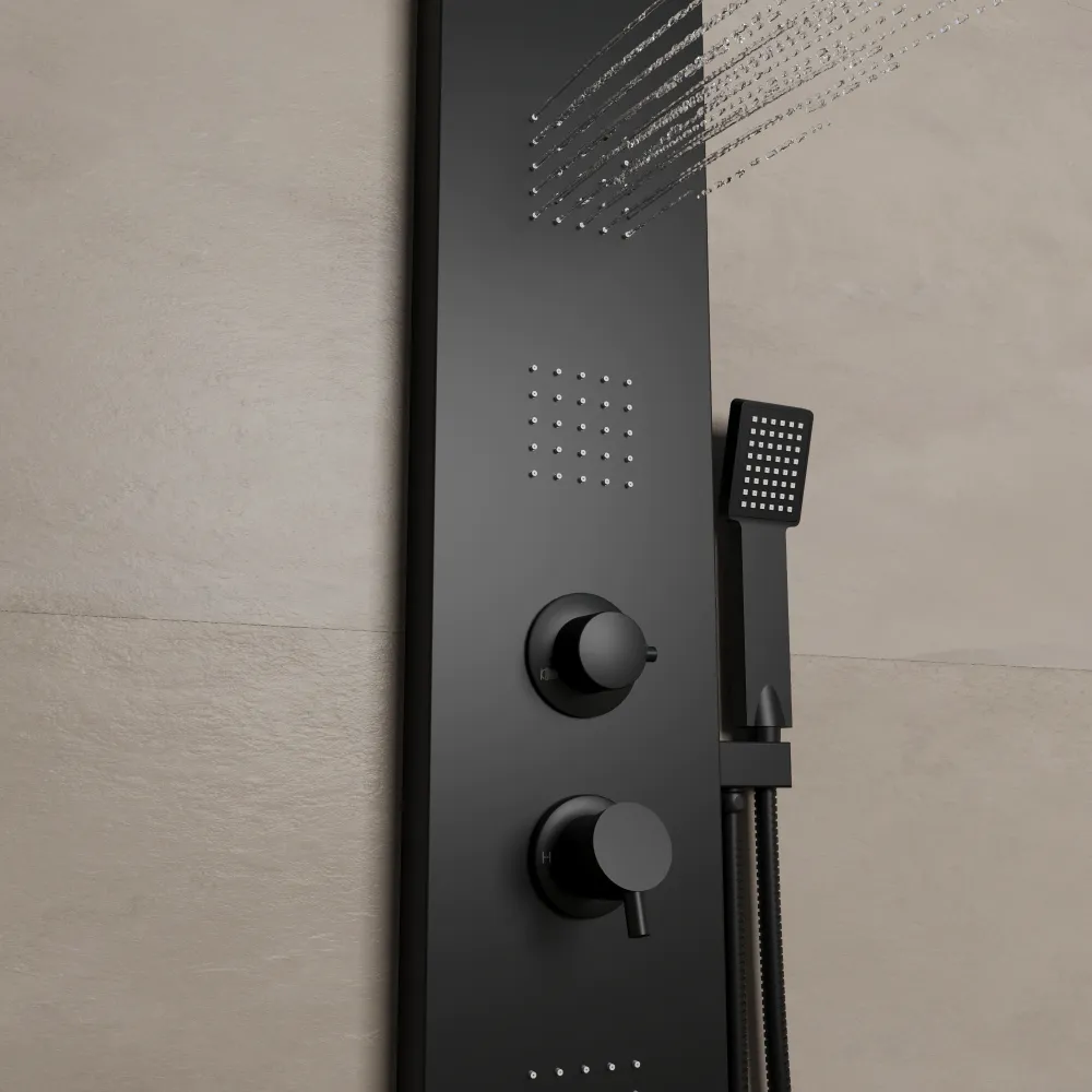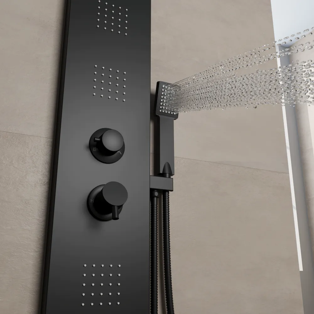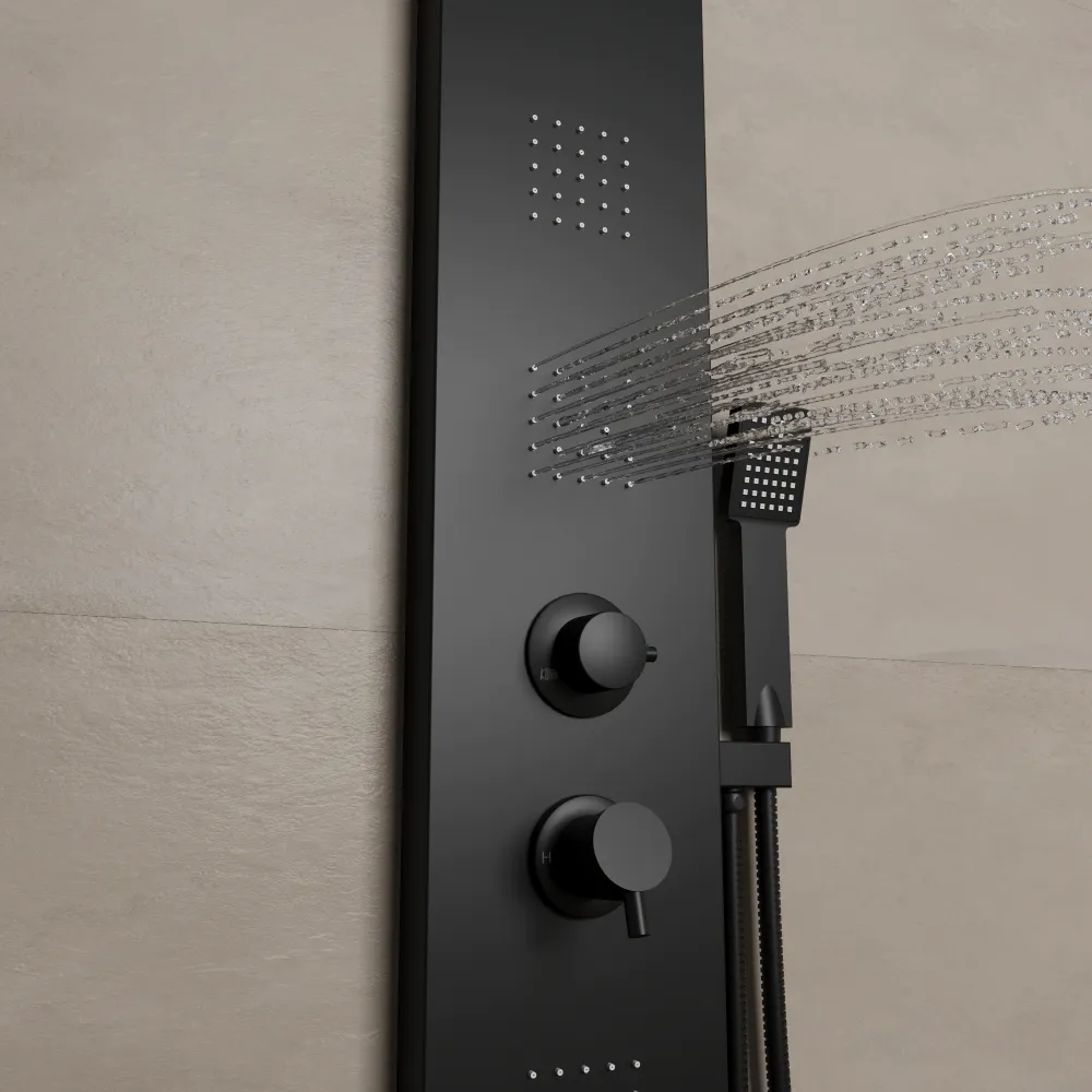 Pannello doccia squadrato in alluminio nero opaco, con doccino, 4 getti e 3 funzioni | Vals