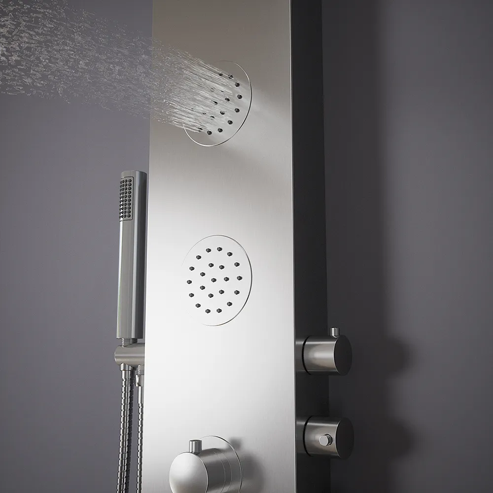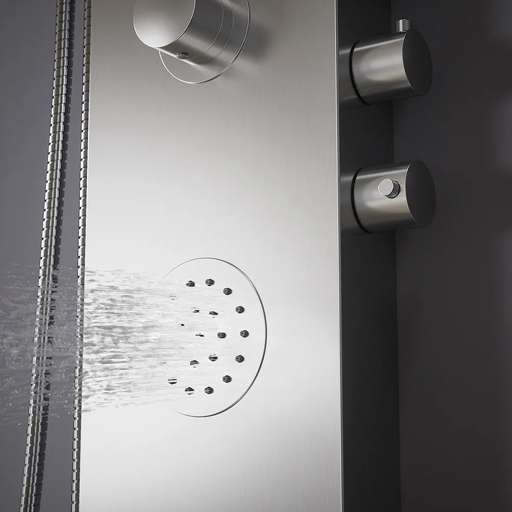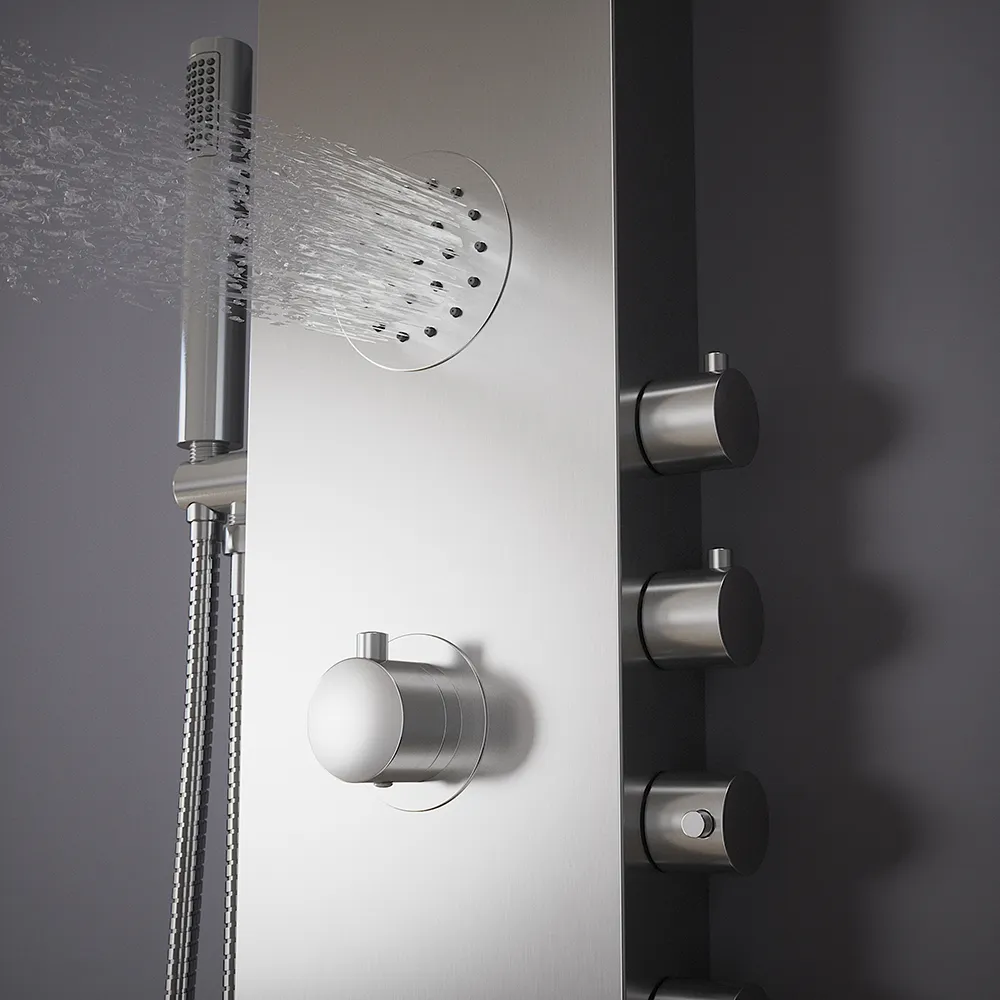 Pannello doccia termostatico con cascata in acciaio cromato, doccino, 4 funzioni | Saturnia