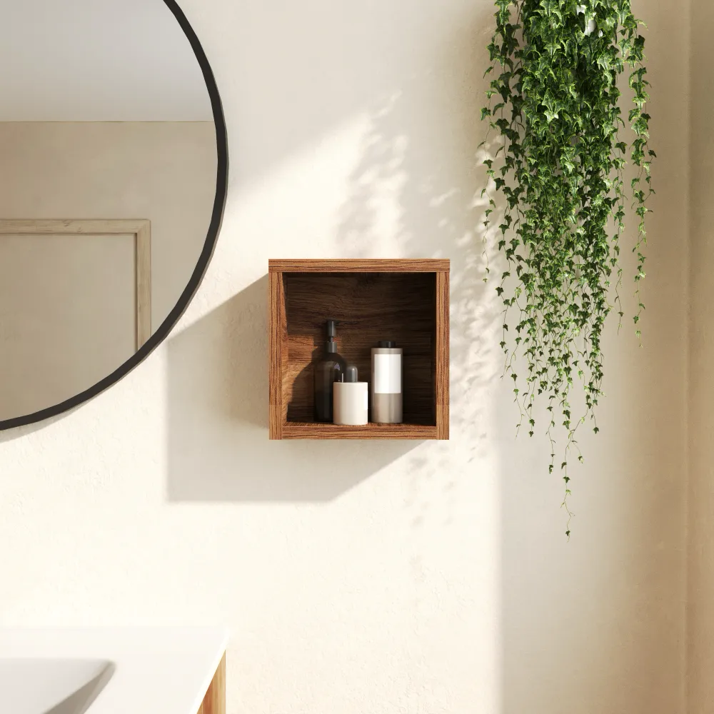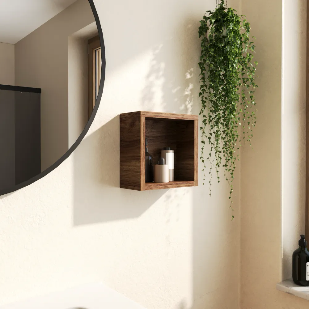 Il pensile sospeso a giorno Berg 25x25 cm in rovere scuro è un elemento d’arredo compatto e versatile, ideale per completare la composizione del tuo bagno.