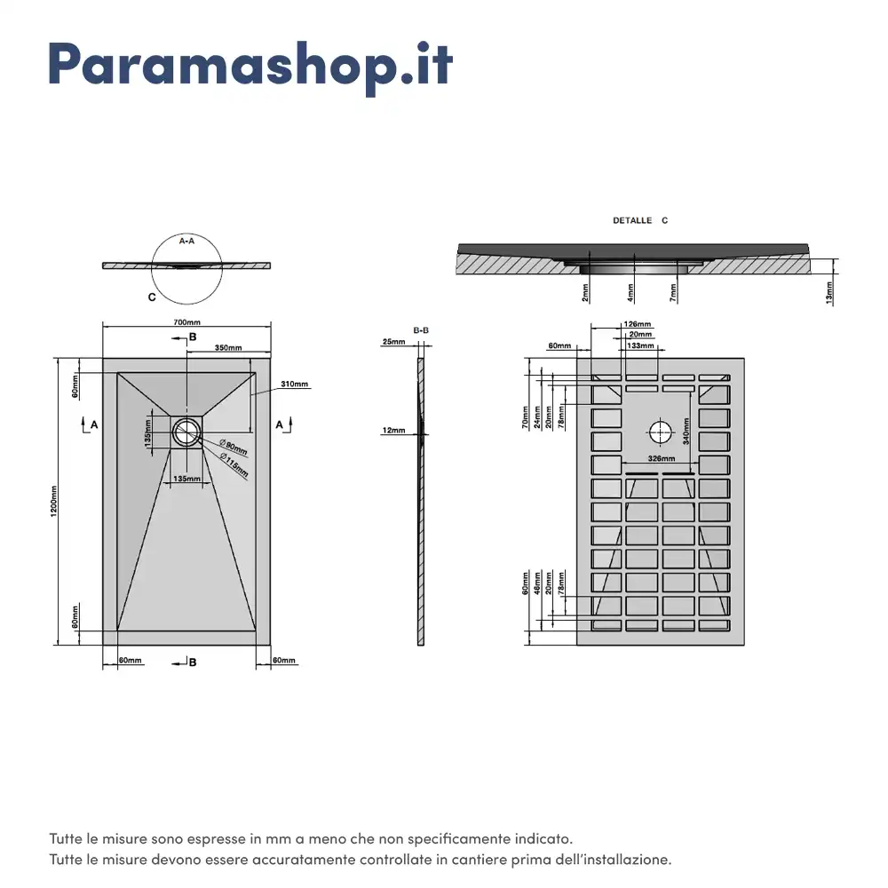 La piletta di scarico non è inclusa ma è acquistabile separatamente sul nostro store (cod. art. AI01DRA001).