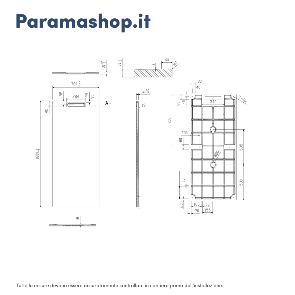 Il piatto doccia Paros è tagliabile, offrendo la possibilità di adattarlo facilmente a diverse dimensioni e forme. Inoltre, è è possibile installarlo in due modi differenti: filopavimento, che crea un effetto elegante e minimalista senza gradini tra il piatto e il pavimento, oppure in appoggio, altrettanto pratica e funzionale, ideale per chi cerca una soluzione più tradizionale.