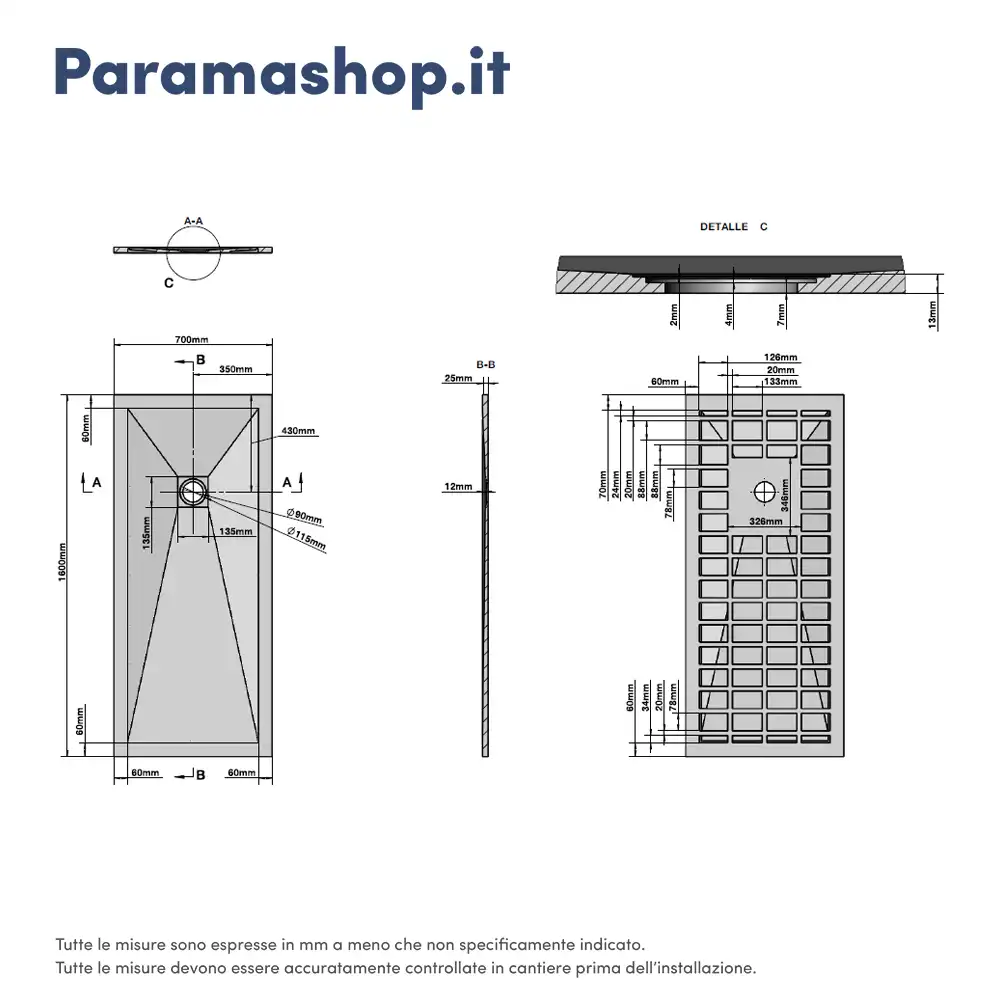 La piletta di scarico non è inclusa ma è acquistabile separatamente sul nostro store (cod. art. AI01DRA001).