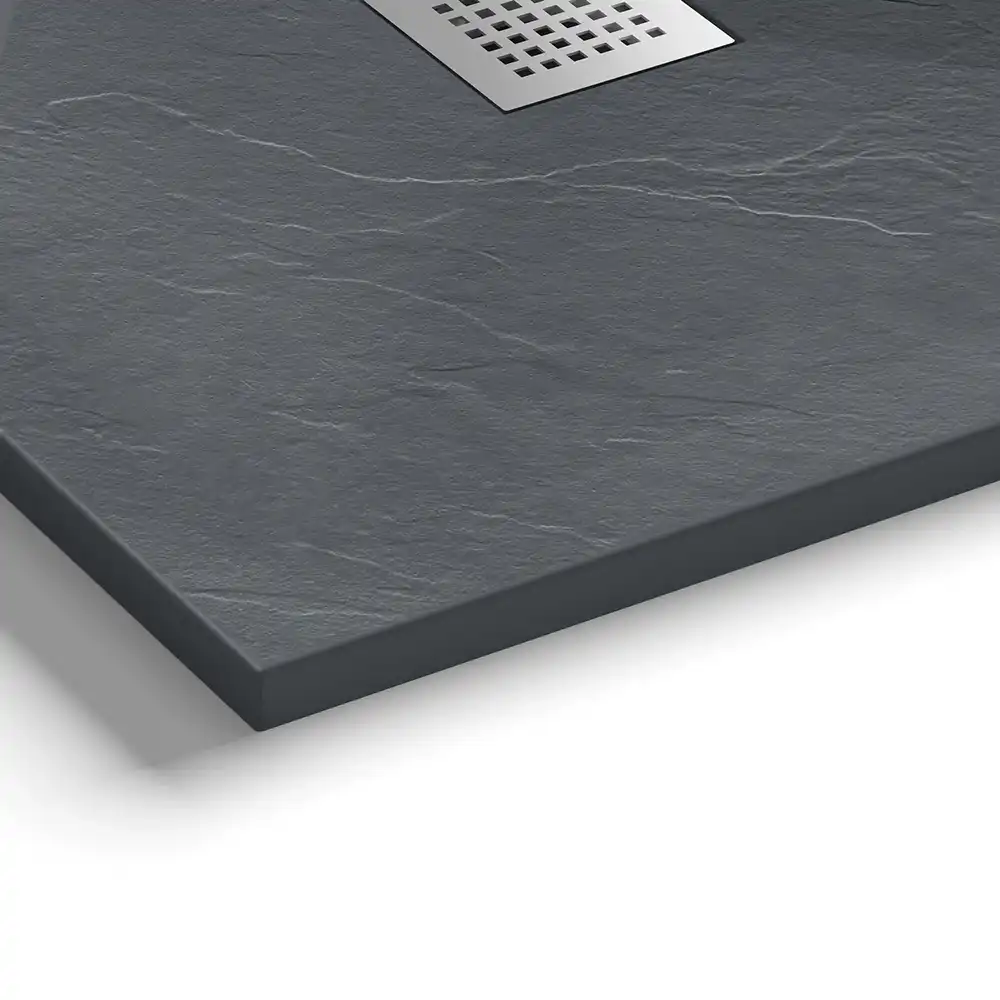 L'elegante finitura ardesia effetto pietra della superficie esalta l'estetica e rende sicuro il piatto doccia anche per bambini e anziani grazie alla sua funzione antiscivolo.