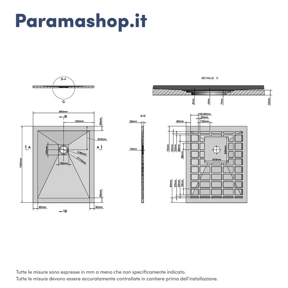 La piletta di scarico non è inclusa ma è acquistabile separatamente sul nostro store (cod. art. AI01DRA001).