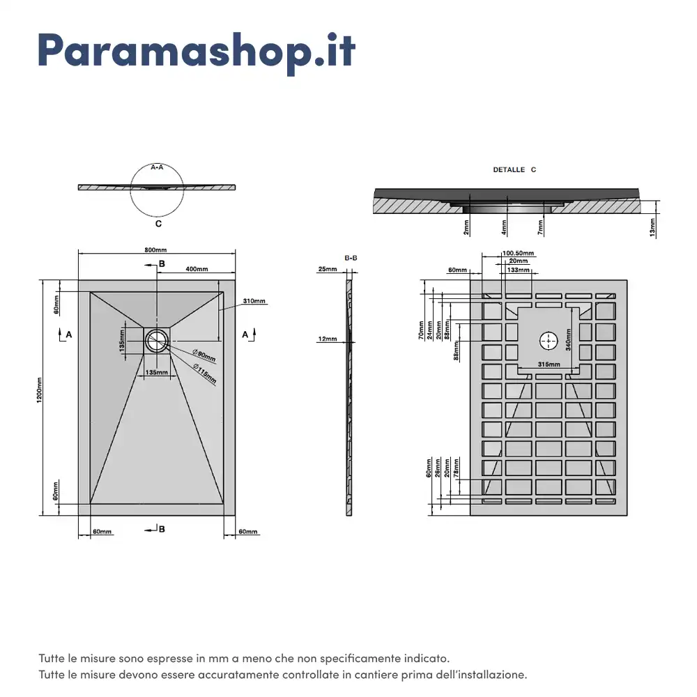 La piletta di scarico non è inclusa ma è acquistabile separatamente sul nostro store (cod. art. AI01DRA001).