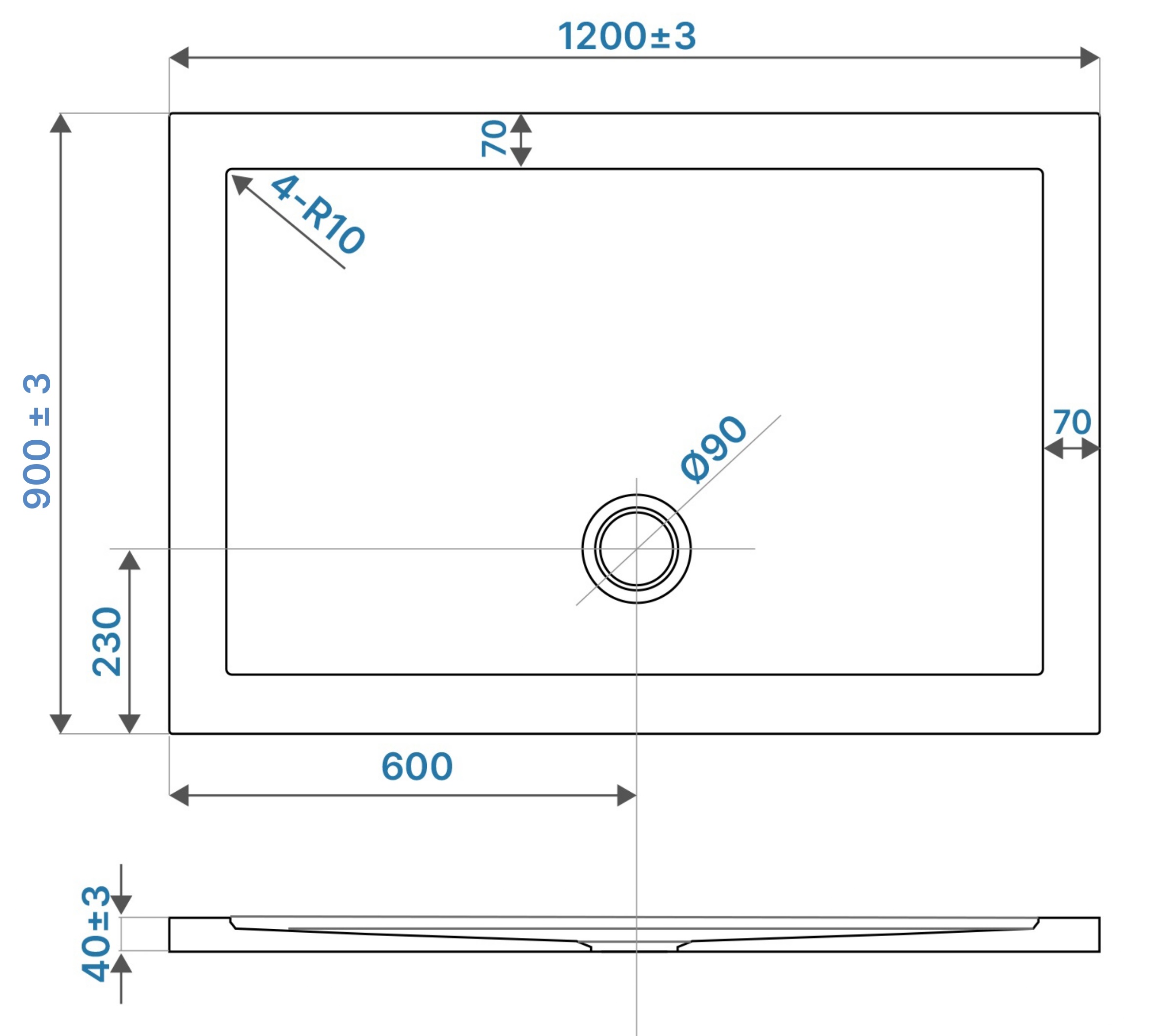 Installabile in appoggio, foro di scarico da 90mm posizionato centralmente sul lato lungo, non riducibile.