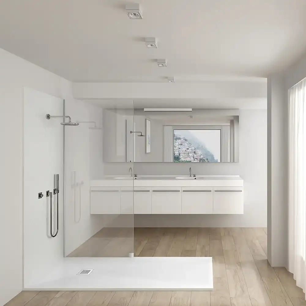 L'altezza ultraslim di soli 2,5cm permette l'installazione sia filopavimento sia in appoggio. Eventuali fuoriquadro riscontrati all'ultimo secondo in cantiere non creeranno alcun problema in quanto è riducibile direttamente in cantiere.