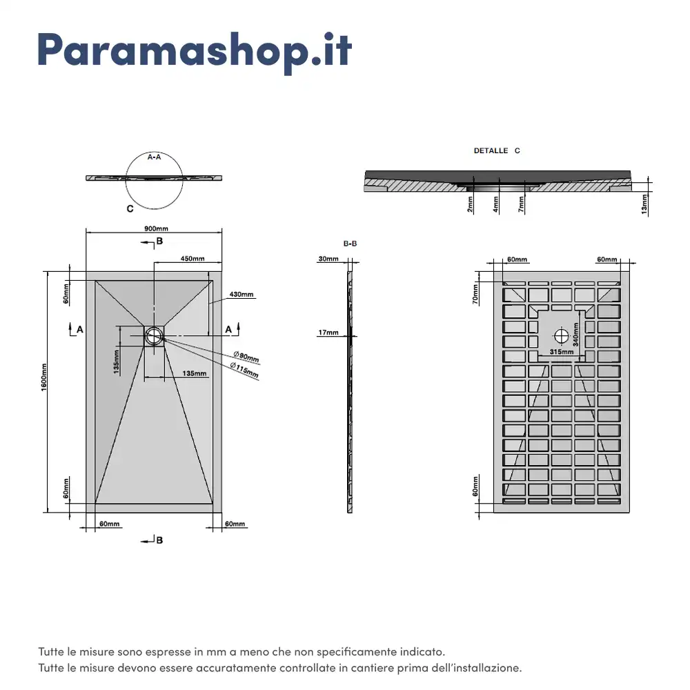La piletta di scarico non è inclusa ma è acquistabile separatamente sul nostro store (cod. art. AI01DRA002).