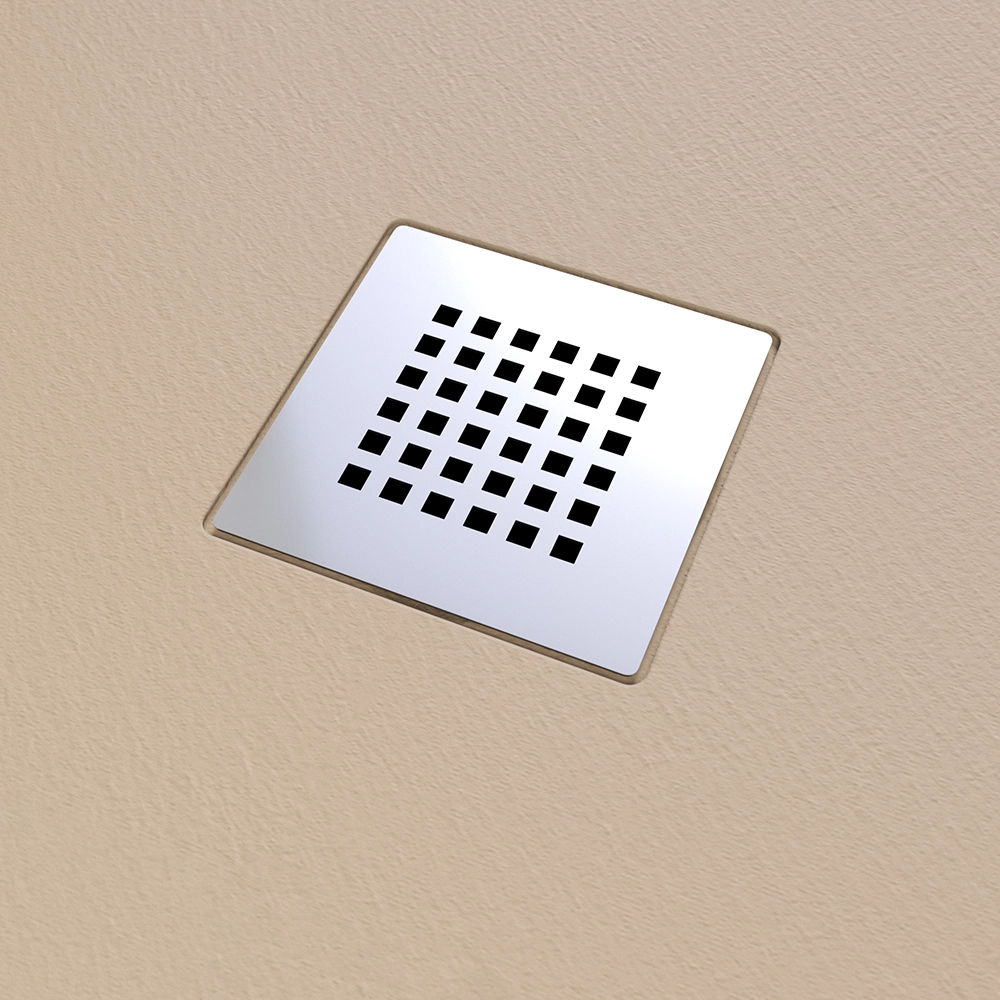 La superficie del piatto doccia è rivestita con uno strato di gel coat e lavorata per ottenere un effetto pietra, rendendolo antiscivolo, antibatterico e altamente resistente. La griglia copri piletta, inclusa, presenta un design che si integra perfettamente con l'aspetto complessivo del piatto doccia, offrendo una finitura coerente e curata.