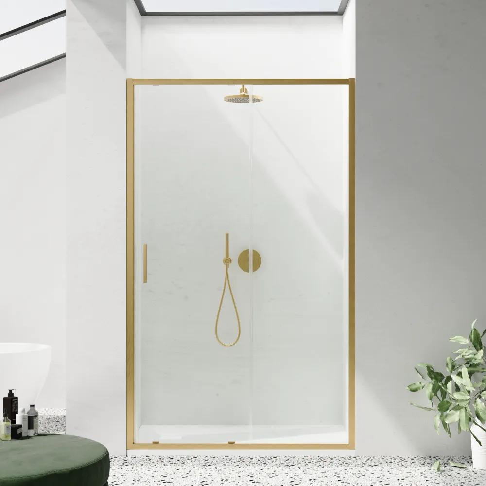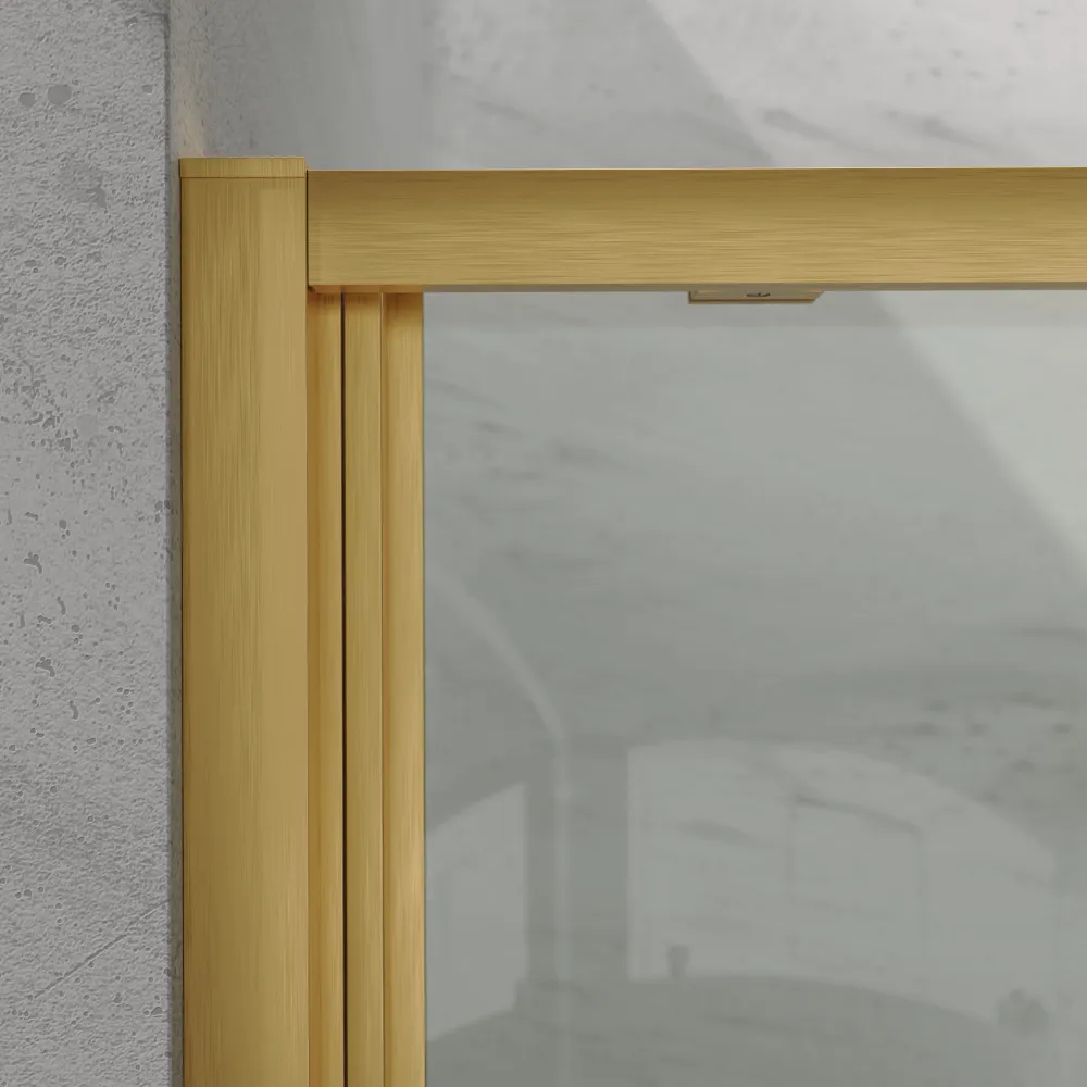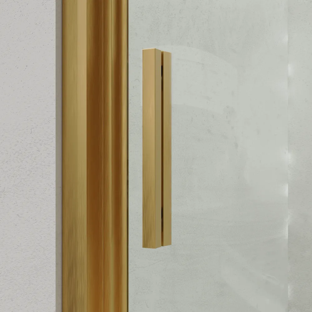 L'elemento distintivo di questa porta doccia sono i suoi profili slim realizzati in alluminio con finitura oro spazzolato. Il loro design minimal lo rende estremamente elegante e contemporaneo. Il vetro temperato trasparente anticalcare da 6 mm consente alla luce di fluire, rendendo l’ambiente più luminoso e accogliente.
