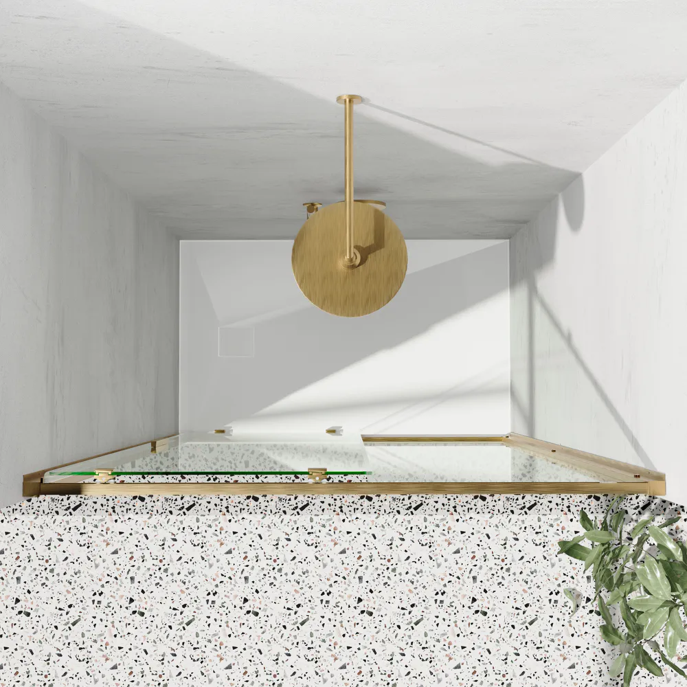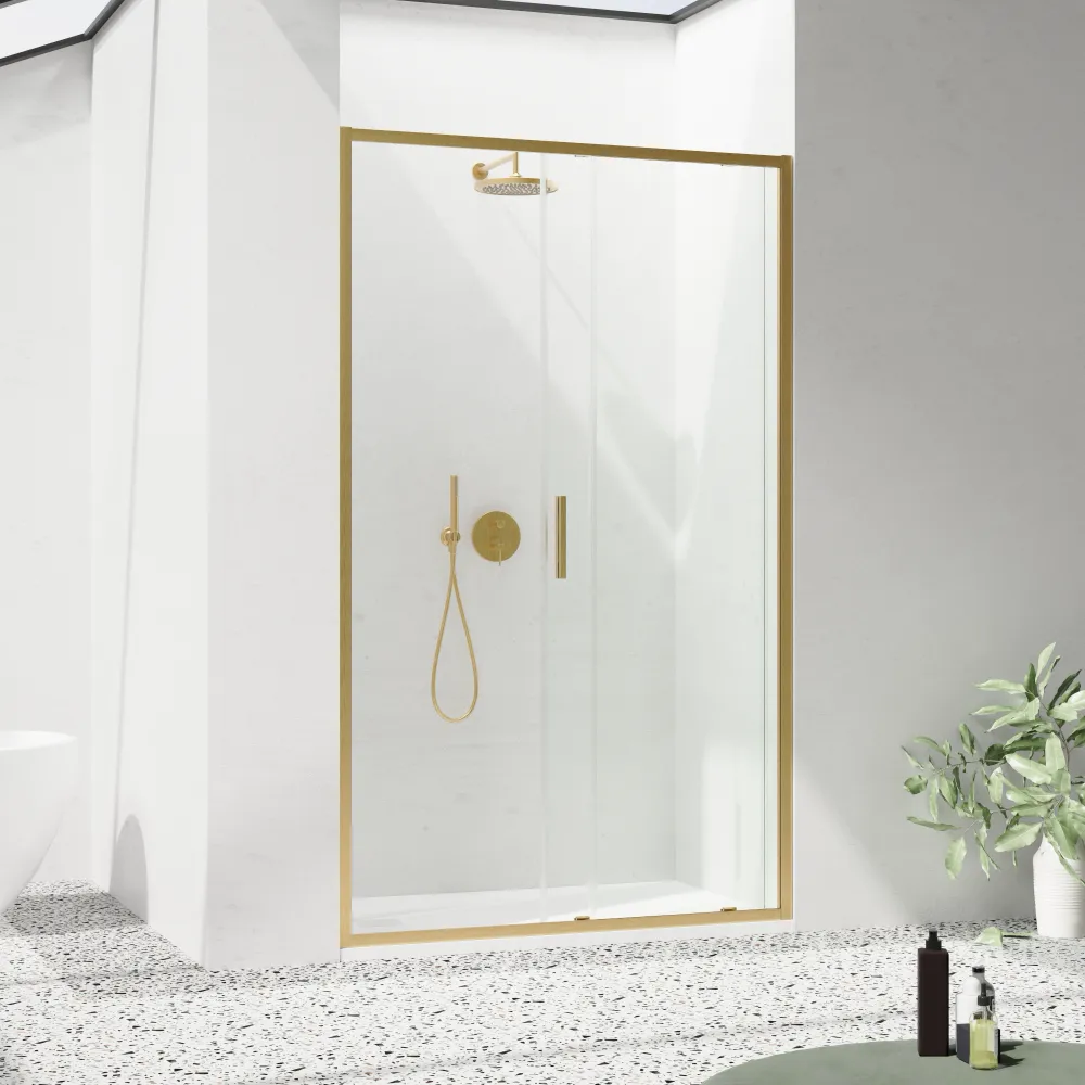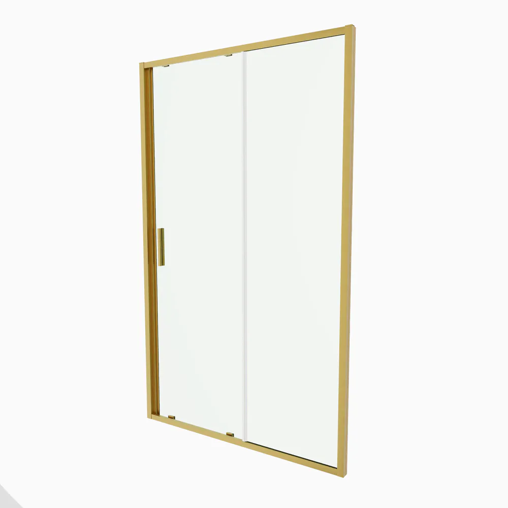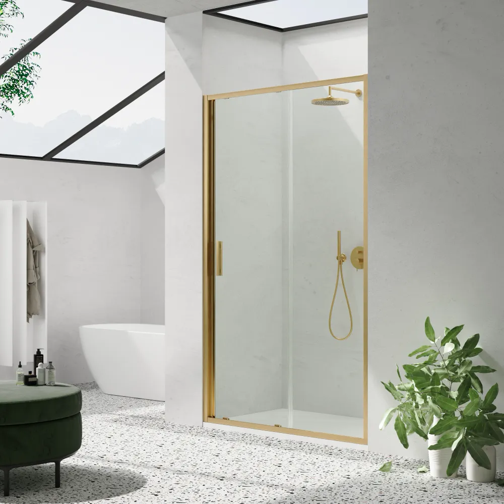 L'elemento distintivo di questa porta doccia sono i suoi profili slim realizzati in alluminio con finitura oro spazzolato. Il loro design minimal lo rende estremamente elegante e contemporaneo. Il vetro temperato trasparente anticalcare da 6 mm consente alla luce di fluire, rendendo l’ambiente più luminoso e accogliente.