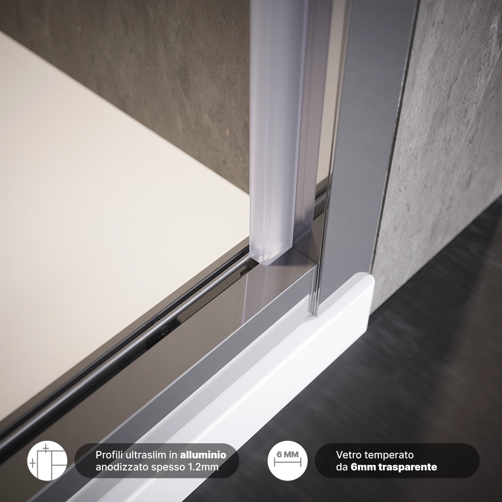 Il vetro temperato da 6mm, certificato secondo gli standard EN12150-1, è disponibile sia in versione trasparente che opaca, offrendo flessibilità e personalizzazione. La sicurezza e la resistenza del vetro sono ulteriormente migliorate dal trattamento easy-clean anticalcare, garantendo una manutenzione senza problemi e una trasparenza cristallina nel tempo.