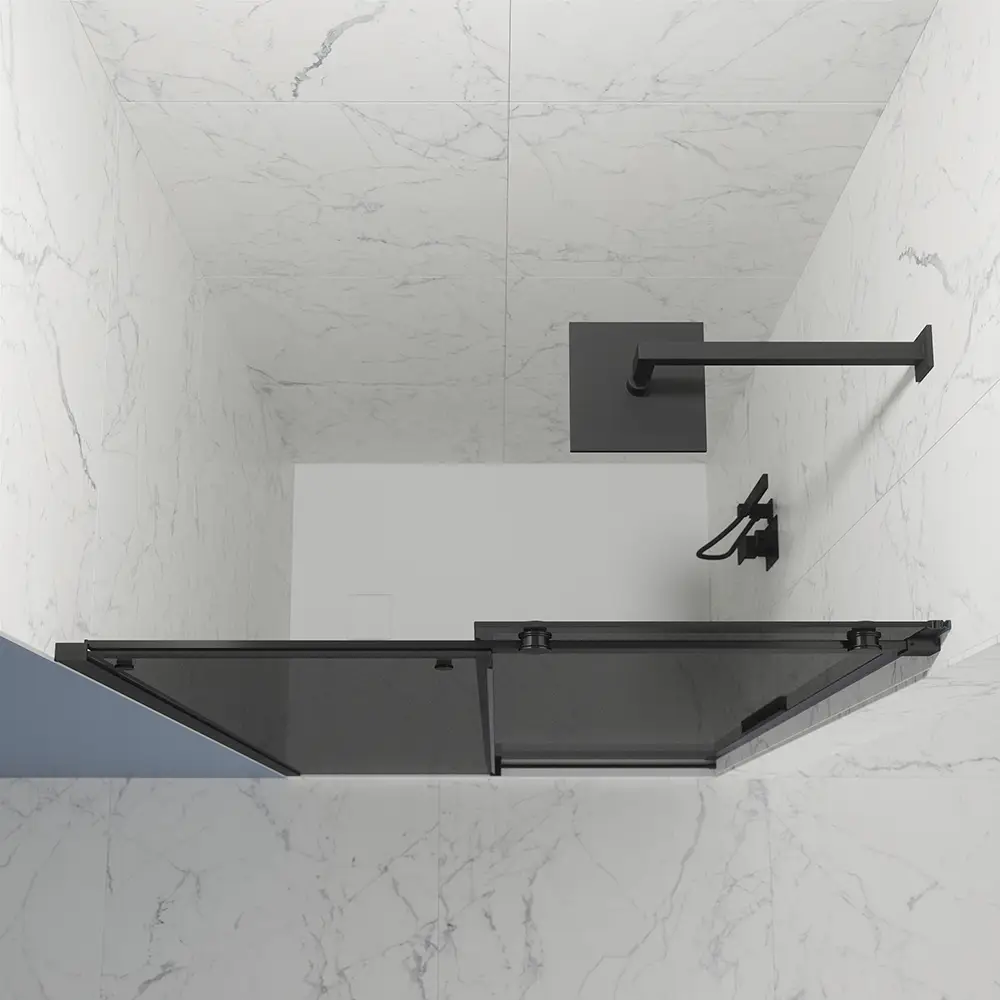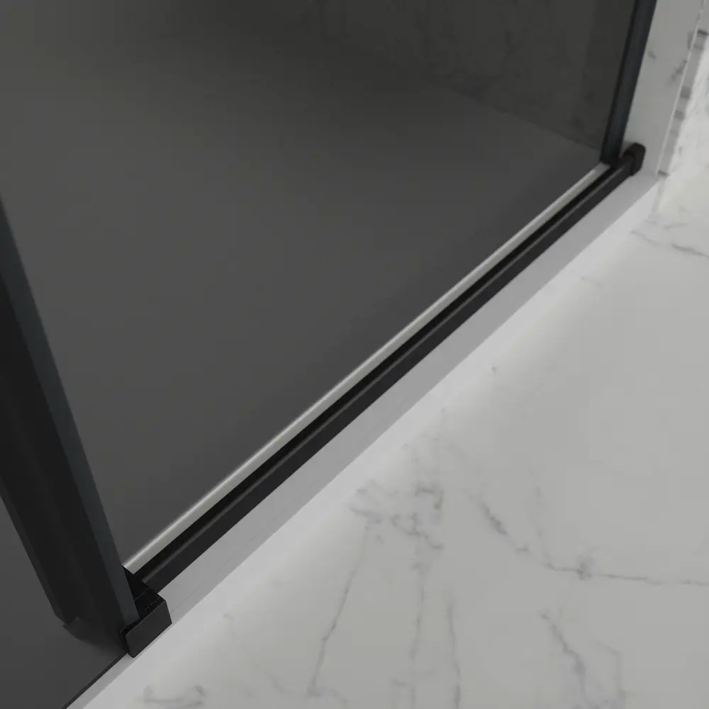 I profili di questo box doccia hanno un'aspetto squadrato e sono realizzati in alluminio anodizzato nero opaco. Il vetro temperato fumé con trattamento anticalcare è spesso ben 8mm ed è certificato secondo lo standard EN12150-1.