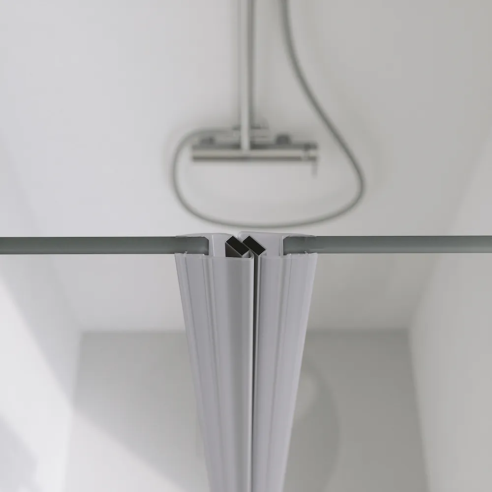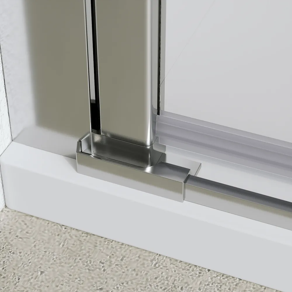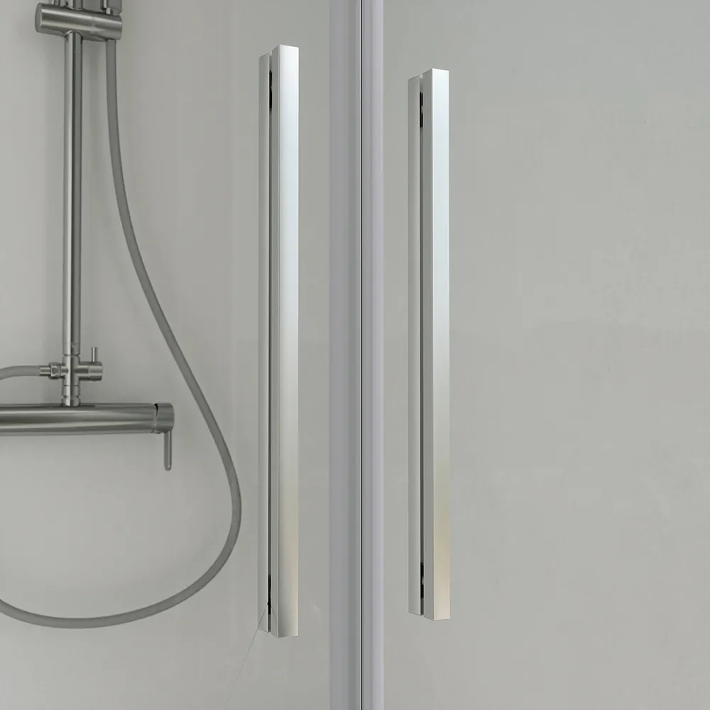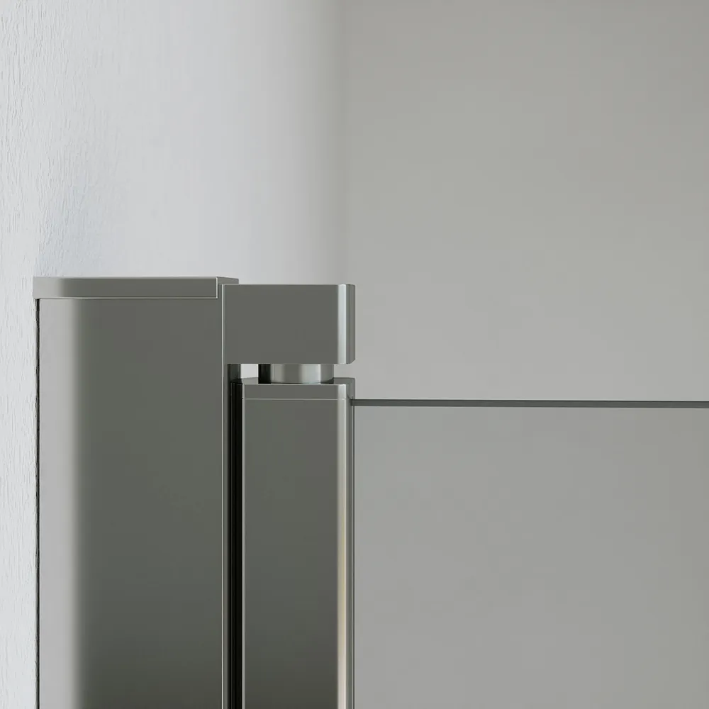 La porta è realizzata in vetro temperato trasparente da 6 mm, resistente e sicuro, che garantisce luminosità e ampiezza visiva. Il trattamento anticalcare facilita la pulizia, prevenendo la formazione di aloni e calcare per mantenere il vetro sempre limpido e brillante.