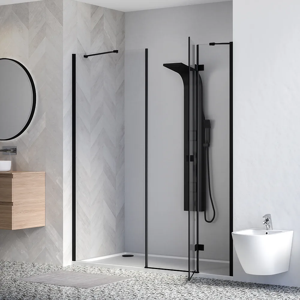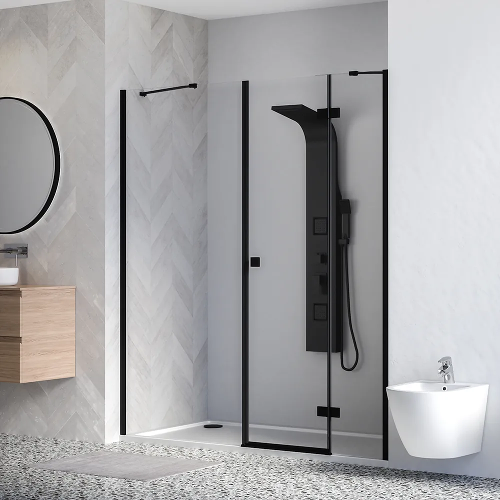 La porta doccia a battente Fiji è la soluzione ideale per chi cerca un perfetto equilibrio tra design moderno, funzionalità e durata nel tempo. Progettata per essere installata in nicchie doccia da 141 a 145 cm, unisce un sistema a battente con cerniere in ottone a una parete fissa laterale, assicurando solidità e stile.