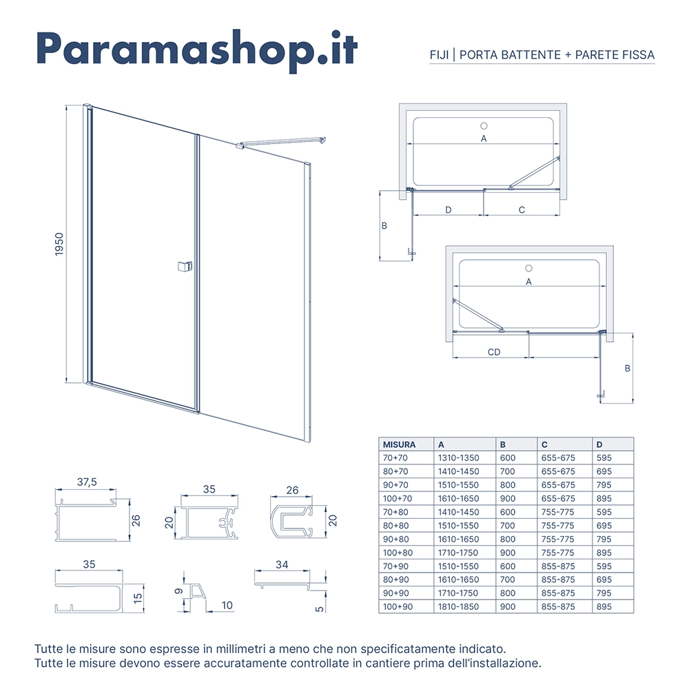 La porta doccia a battente Fiji è progettata per essere installata in nicchie con larghezza compresa tra 161 e 165 cm. Grazie al suo sistema di regolazione, si adatta perfettamente a queste misure, garantendo una chiusura precisa e sicura.