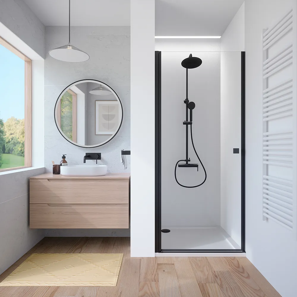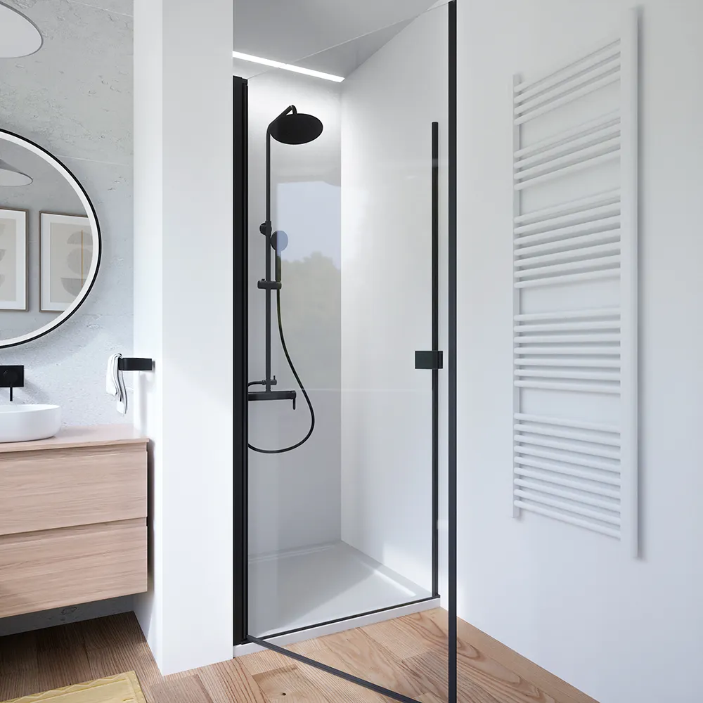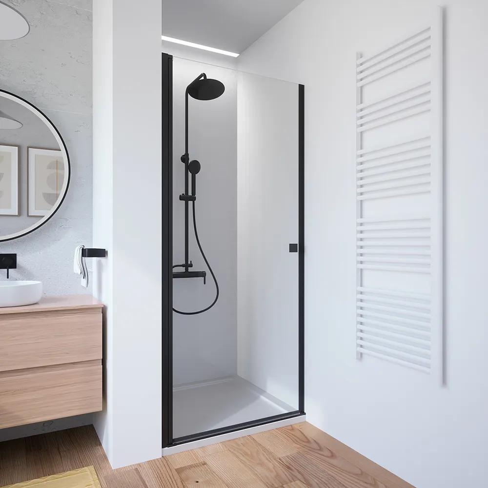 Porta doccia 70cm apertura a battente con profili nero opaco e vetro da 8mm trasparente h195 | Fiji
