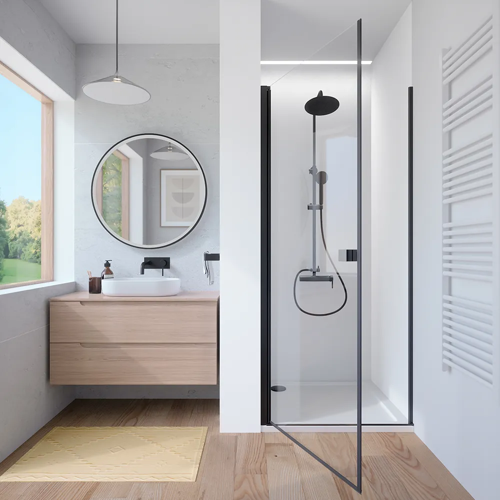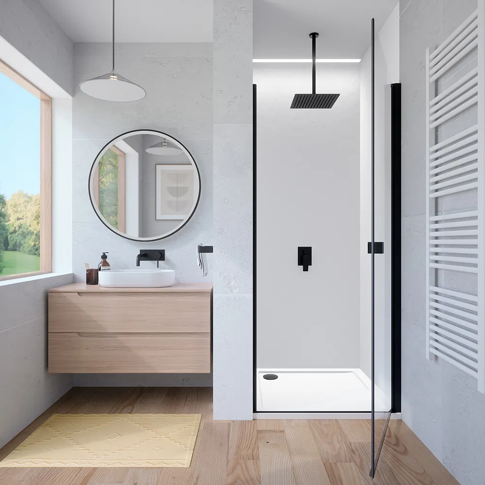 L'altezza di 195cm garantisce una protezione completa contro gli schizzi d'acqua, mantenendo l'ambiente bagno asciutto e pulito. L'apertura a battente, inoltre, consente un facile accesso alla zona doccia, ottimizzando lo spazio disponibile e assicurando la massima praticità. Questa soluzione è perfetta anche per ambienti con spazi limitati, permettendo un’entrata e uscita agevole dalla doccia.