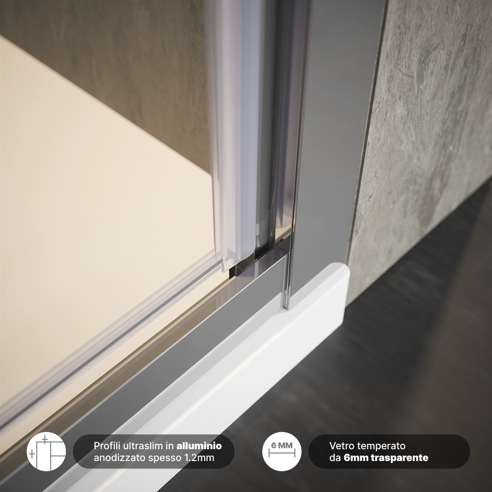 Il vetro temperato da 6 mm, certificato secondo gli standard EN12150-1, è disponibile sia in versione trasparente che opaca, offrendo opzioni personalizzate. Questo materiale di alta qualità, unito al trattamento easy-clean anticalcare, non solo garantisce sicurezza e resistenza ma semplifica anche la manutenzione, mantenendo il vetro cristallino nel tempo.