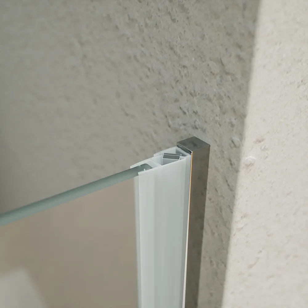 La porta è realizzata in vetro temperato opaco da 6 mm, che offre un’efficace privacy senza rinunciare alla robustezza e alla sicurezza. Il trattamento anticalcare assicura una manutenzione semplice, mantenendo il vetro pulito e senza aloni nel tempo.