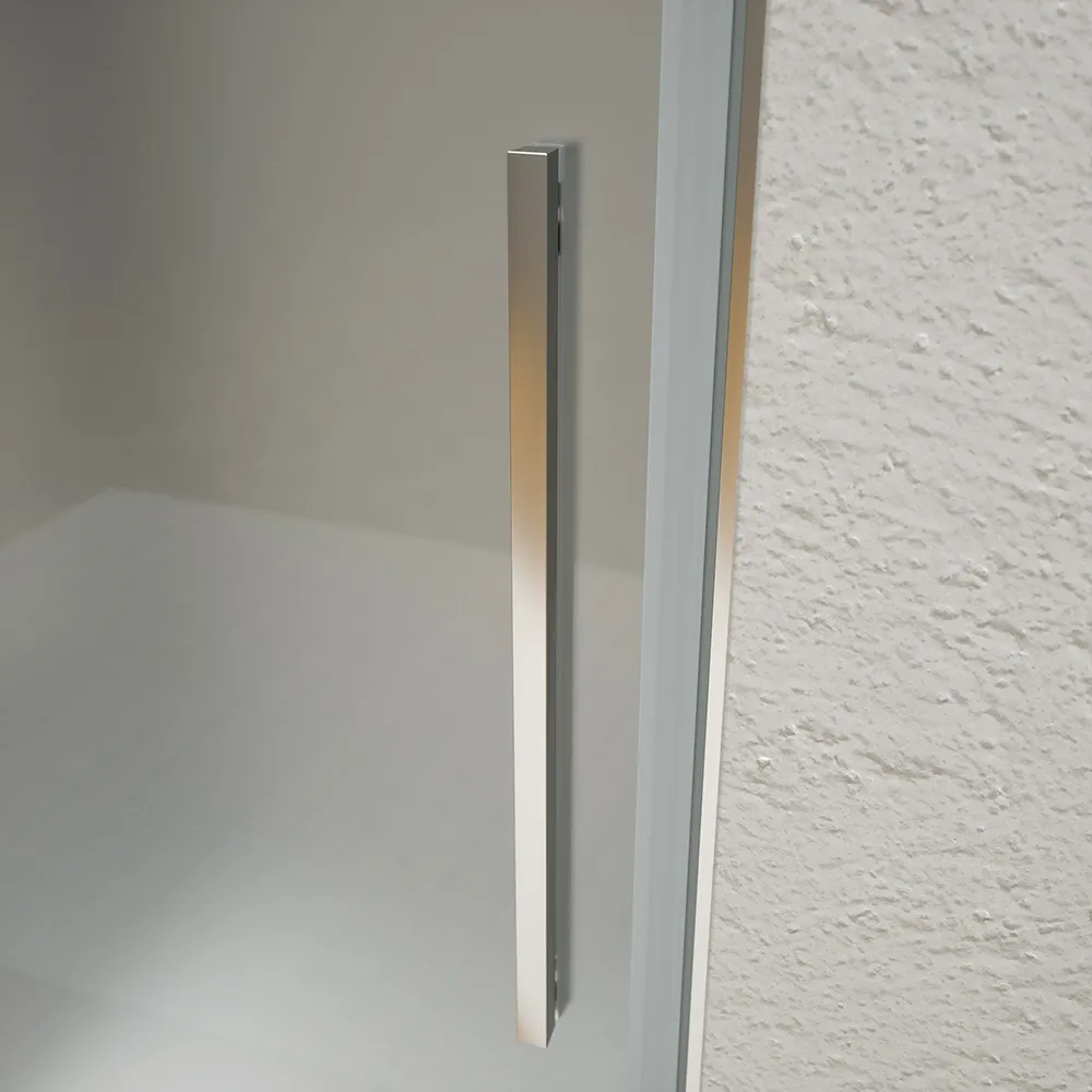 I profili in alluminio cromato donano alla porta un aspetto raffinato e luminoso. La finitura lucida valorizza l’estetica del vetro opaco. Inoltre, la porta è dotata di una maniglia in alluminio lunga 40 cm, progettata per offrire una presa sicura e comoda.