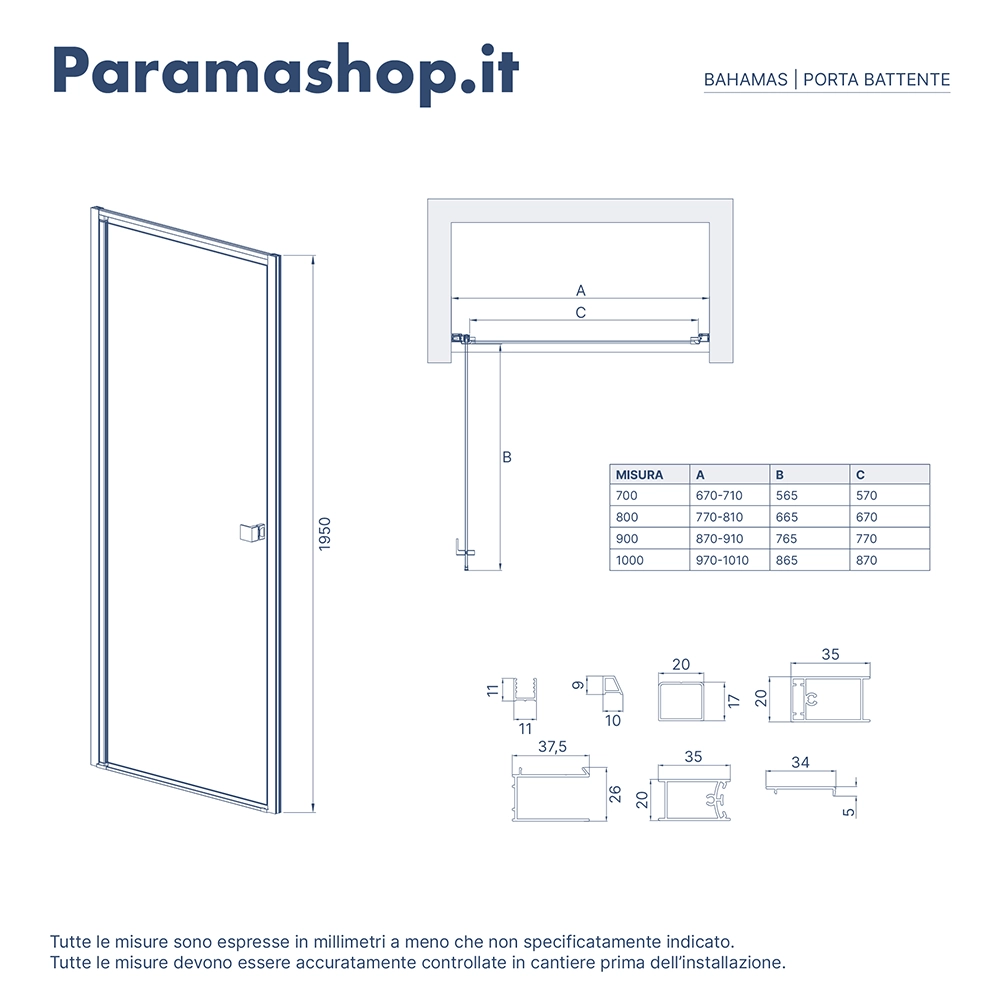 Porta doccia 90cm apertura a battente con profili cromati e vetro da 8mm trasparente h195 | Bahamas