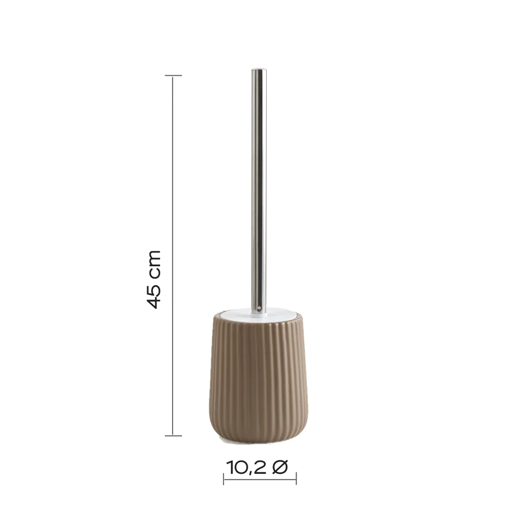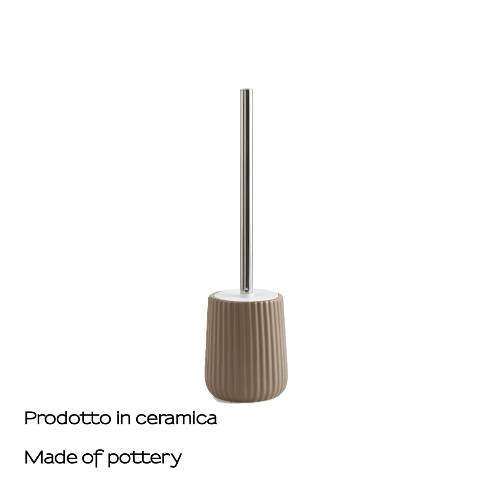 Strutturato con il corpo in ceramica di colore tortora per apportare un tocco di vivacità all'arredo dell'ambiente bagno e per una pulizia facile e veloce, il manico in acciaio inox e le pratiche setole in nylon.