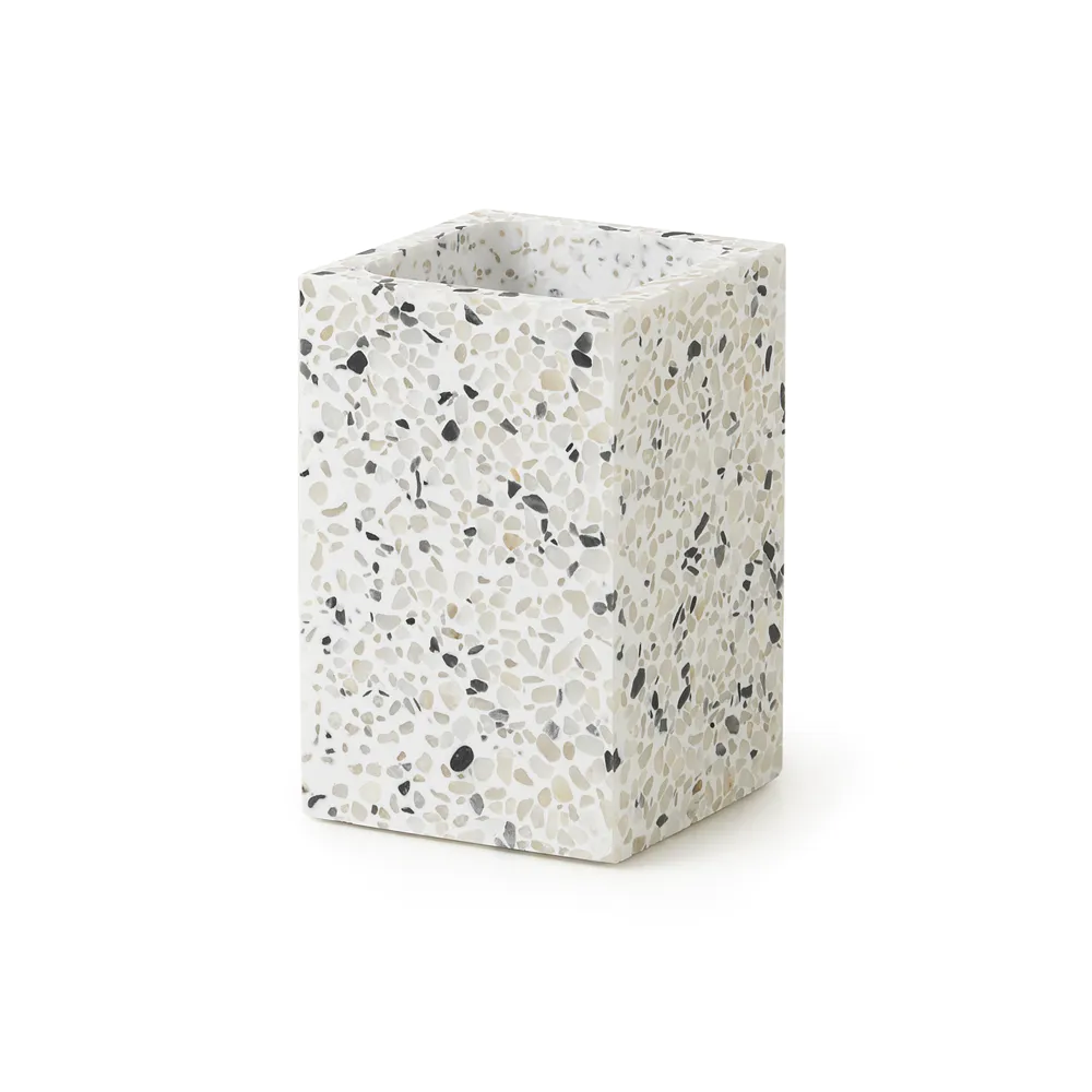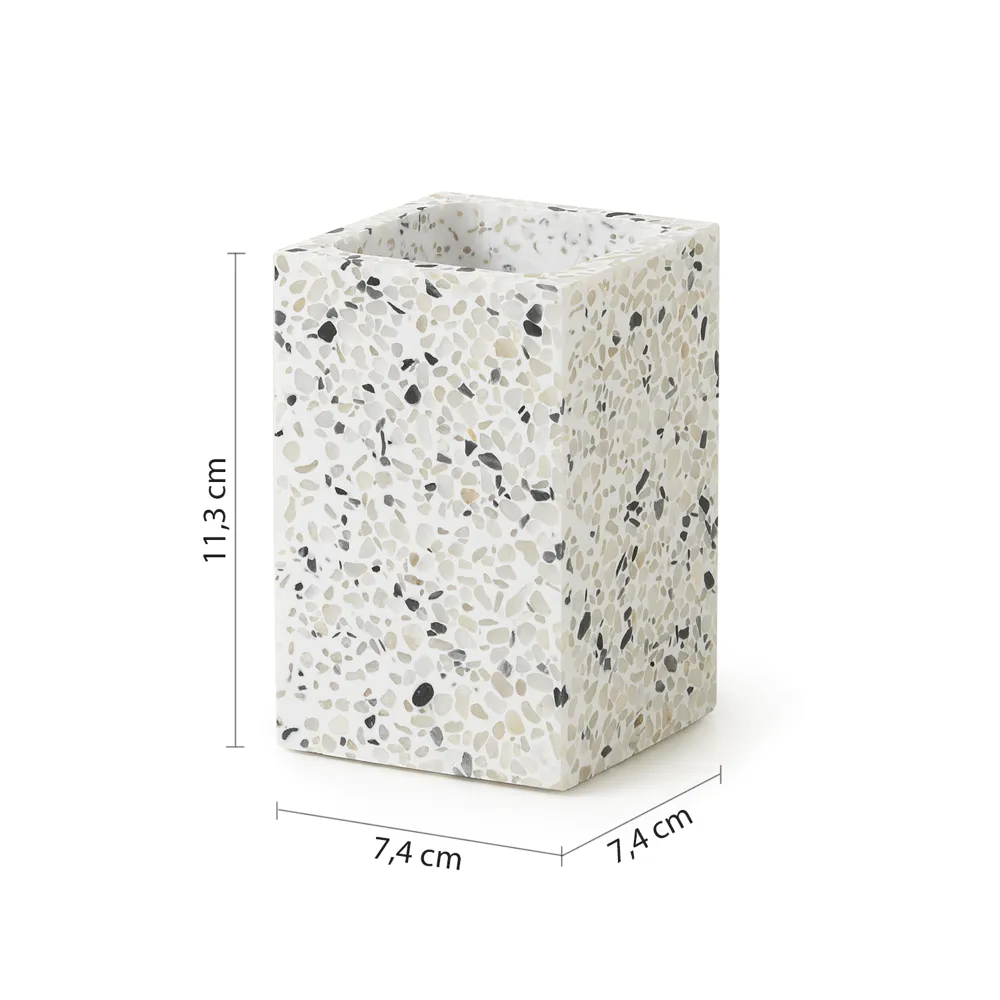 Il bicchiere porta spazzolini della serie Zoe da appoggio di Gedy presenta una finitura esclusiva in graniglia marmo bianco/nero, realizzato in resina e pietre per una resistenza ottimale. Un accessorio funzionale e raffinato, ideale per mantenere ordine con stile nel bagno, grazie a un design contemporaneo e naturale.