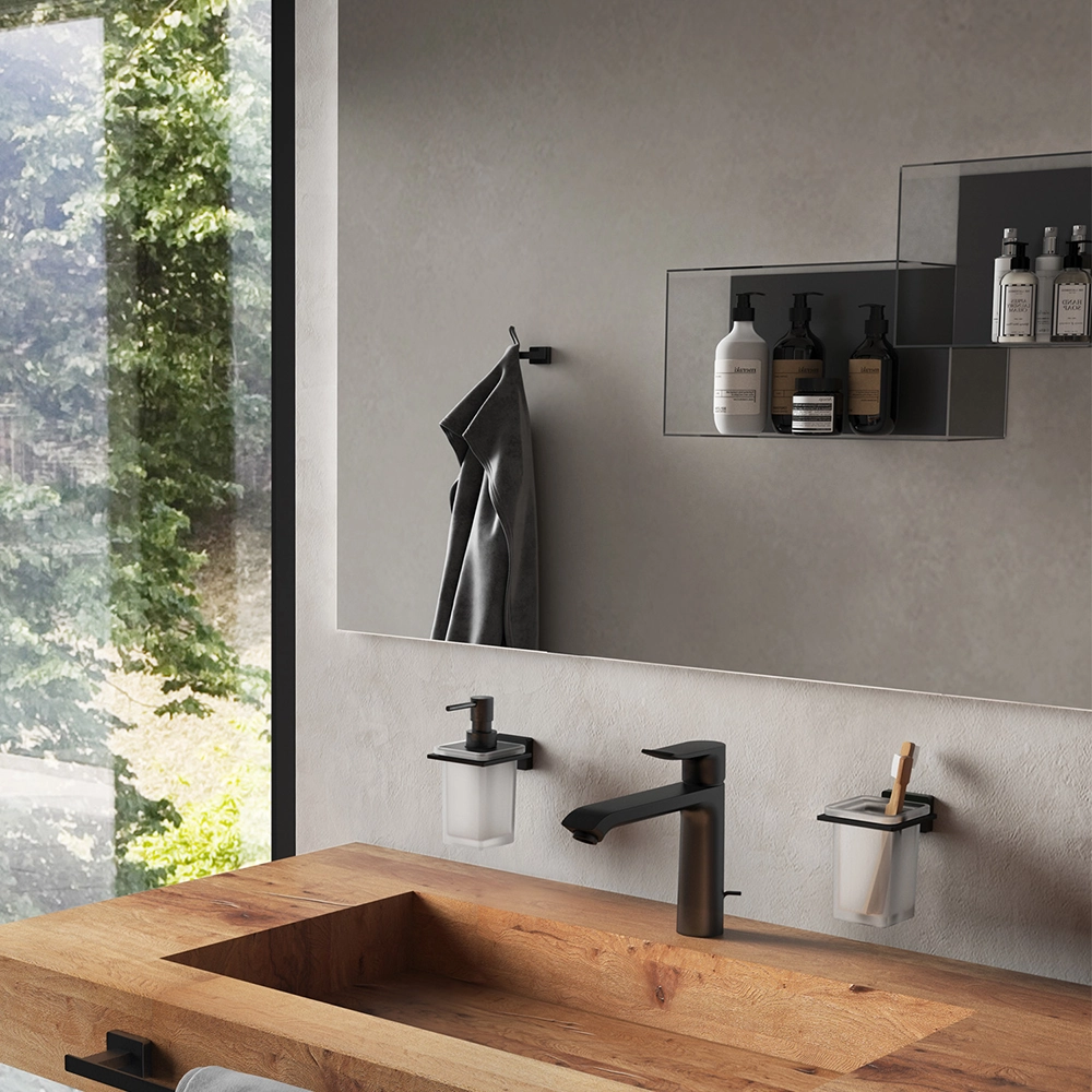 L'eccellente finitura nero opaco è realizzata con la tecnologia Cromall, che garantisce una superficie resistente alla corrosione e duratura nel tempo. Atena è la scelta ideale per chi cerca un portaspazzolino pratico, resistente e dal design ricercato.