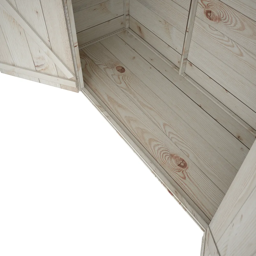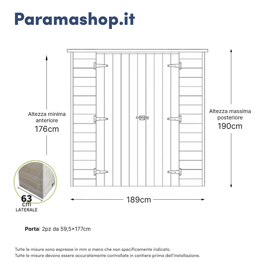 La base misura 1,89 x 0,63 m, mentre lo spazio utile interno è di 1,84 x 0,60 m. L’altezza frontale è di 1,76 m e sale gradualmente fino a 1,90 m sul retro, seguendo la pendenza naturale del tetto. Il pavimento in legno è incluso, così come tutta la ferramenta e il manuale per il montaggio.
