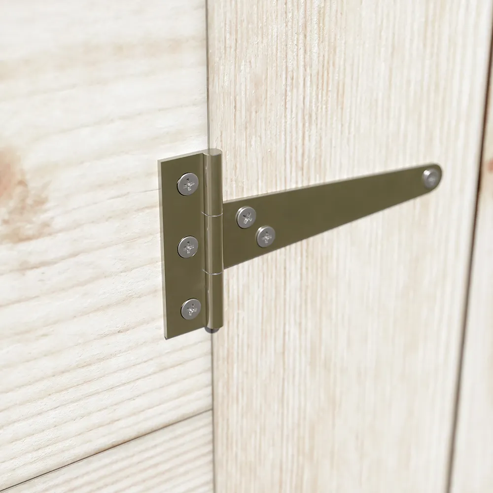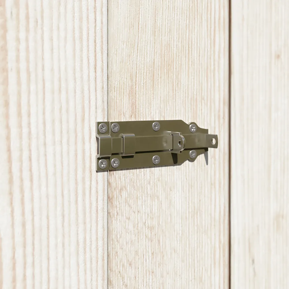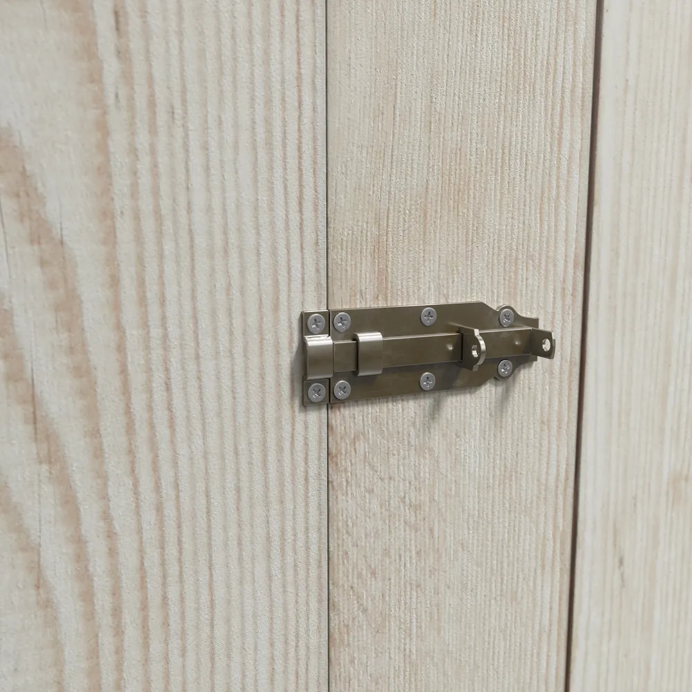 Due ante frontali da 0,595 x 1,77 m permettono un accesso agevole, con catenaccio predisposto per lucchetto (lucchetto non incluso). Questo modello nasce per essere appoggiato direttamente a una parete, pertanto la parete posteriore non è inclusa ed è pensata proprio per sfruttare il muro come chiusura naturale.