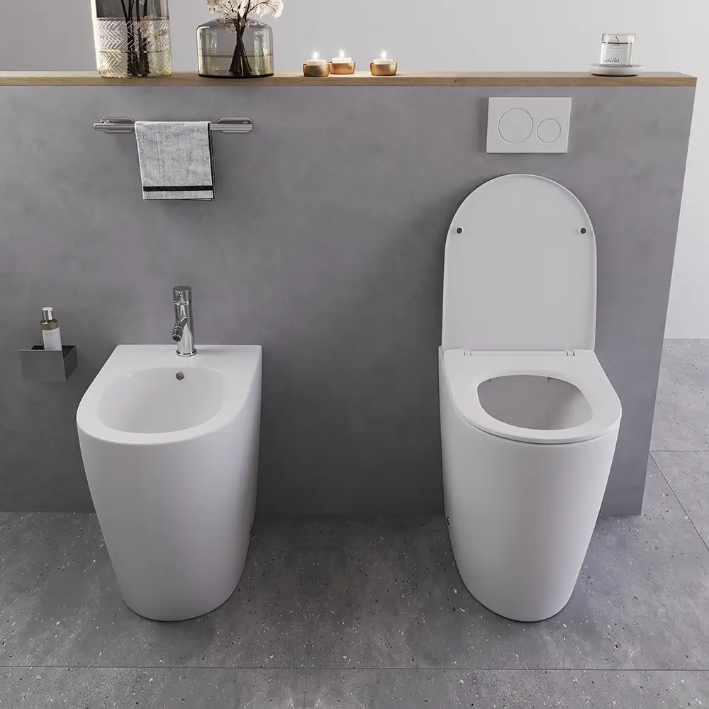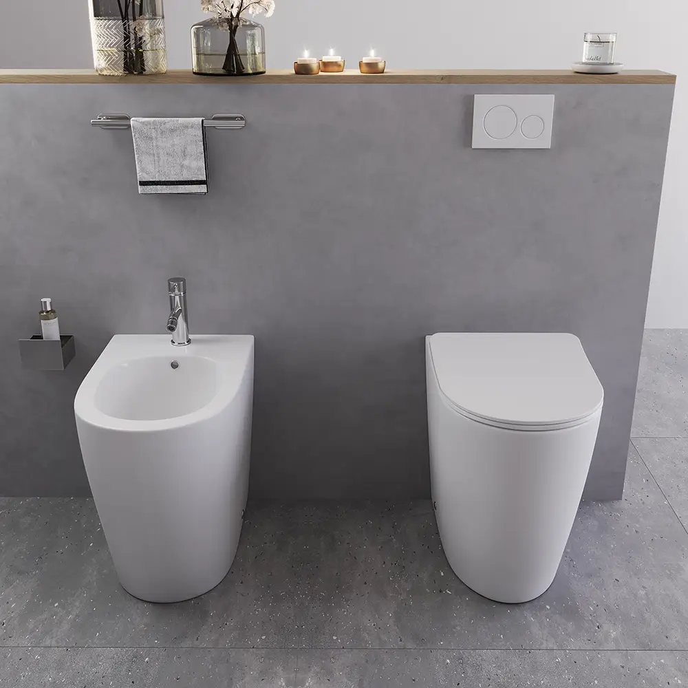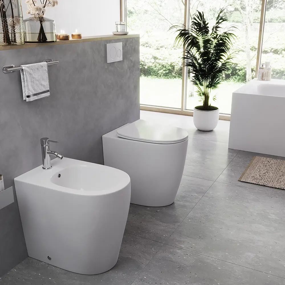 Il set wc+bidet è fornito assieme all'apposito sedile coprivaso con chiusura rallentata, o soft-close. Le speciali cerniere permettono una chiusura dolce della tavoletta anche quando non accompagnata manualmente fino al fine corsa. Una chicca che lascerà a bocca aperta tutti gli ospiti e che vi permetterà di aumentare la vita utile dei sanitari, prevenendo urti altrimenti inevitabili.