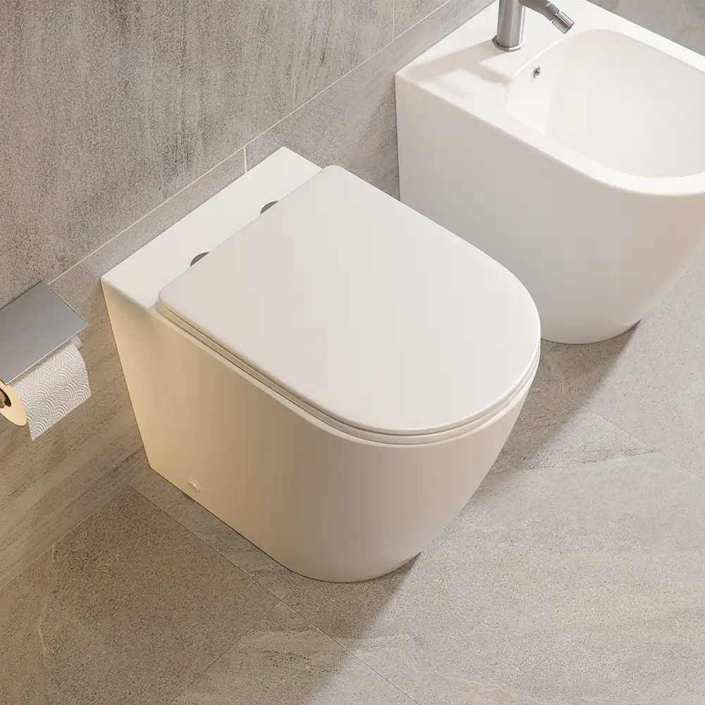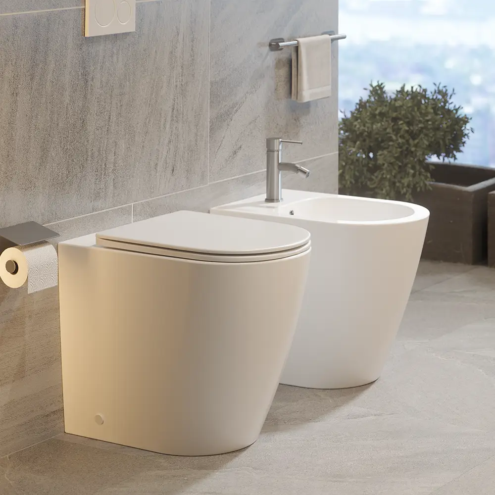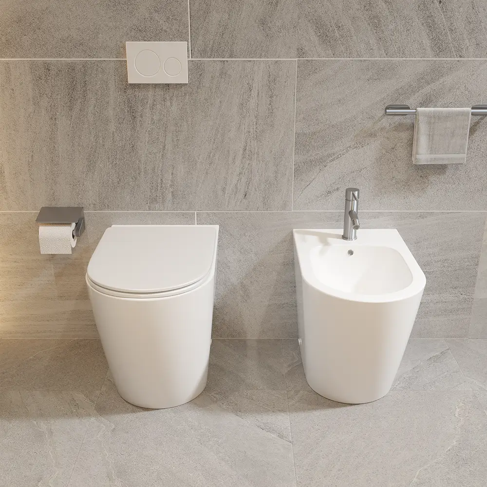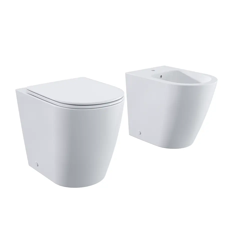Sanitari filomuro comfort in ceramica bianco lucido vaso rimless h44,5 cm con copriwc soft-close e bidet | Europa