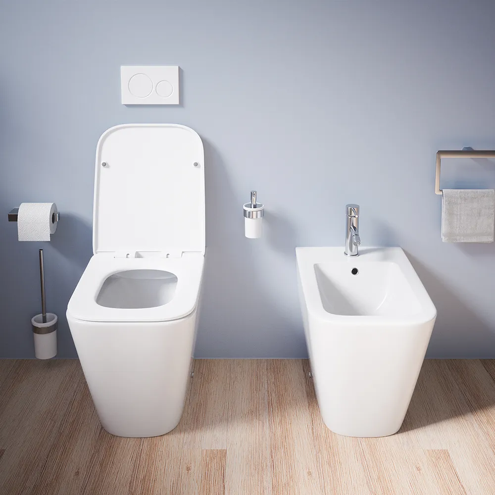 Kyoto è inoltre dotato di un sedile copri-wc soft-close, che previene le chiusure brusche, assicurando una chiusura silenziosa e delicata. Questo dettaglio non solo aumenta il comfort, ma anche la durabilità del sedile, riducendo il rischio di danni nel tempo. Il copri WC è realizzato in resina termoindurente UF (Urea-Formaldeide), un materiale noto per la sua resistenza e durevolezza. Grazie alla sua rigidità, alla resistenza ai graffi e alla facilità di pulizia, assicura igiene e un'elevata durata nel tempo. Con una lunghezza di 54 cm, sia il vaso che il bidet offrono la dimensione adatta ad ogni tipologia di ambiente bagno.
