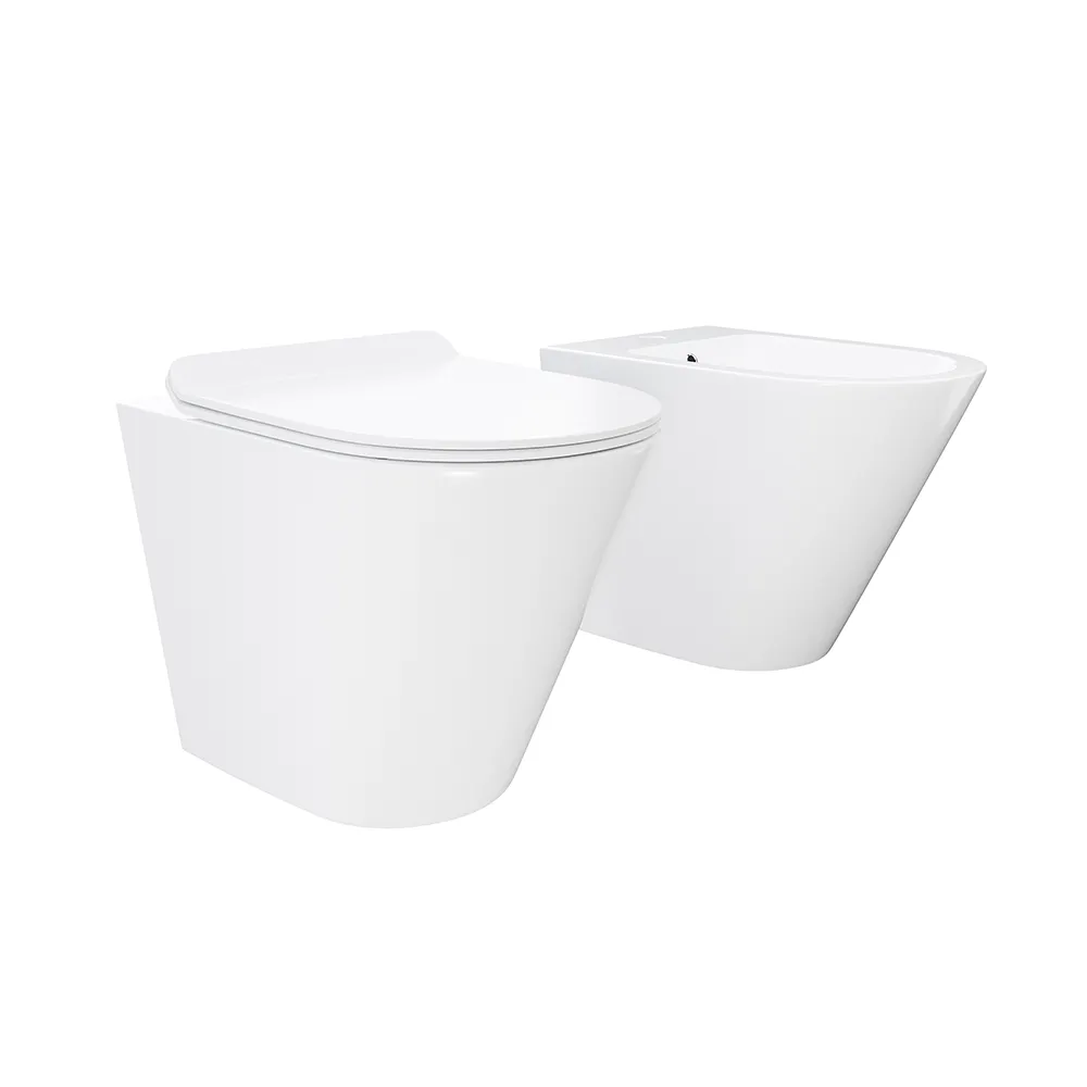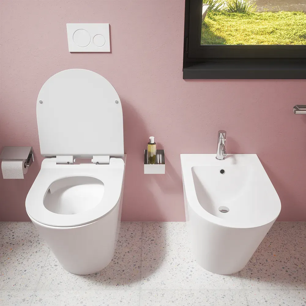Sanitari filomuro in ceramica bianco lucido vaso tornado silent flush sedile soft-close e bidet | Rio