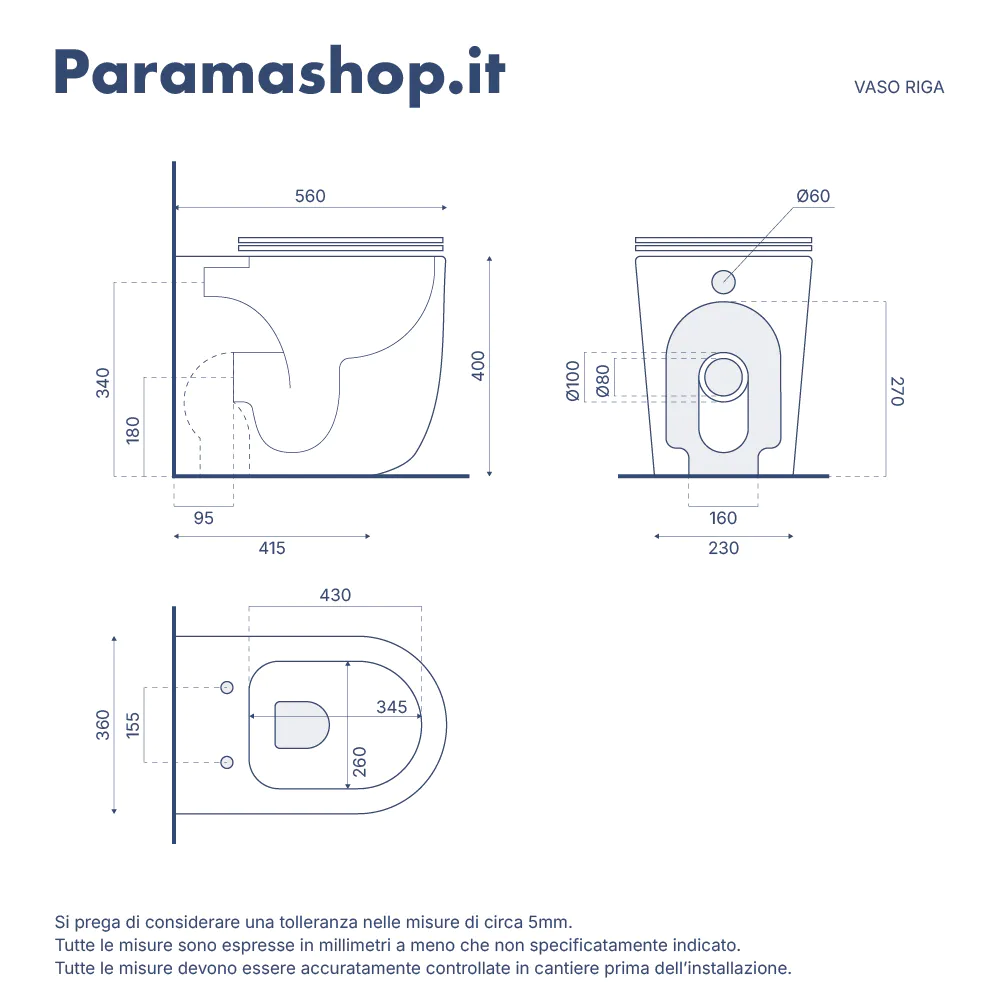 La confezione del prodotto include: wc, sedile copri-wc e il kit per il fissaggio a pavimento. Si prega di notare che la curva tecnica (cod.art.: SAN00CUR001), il sifone e la piletta di scarico non sono inclusi, ma sono acquistabili separatamente nell'apposita sezione sul nostro store.