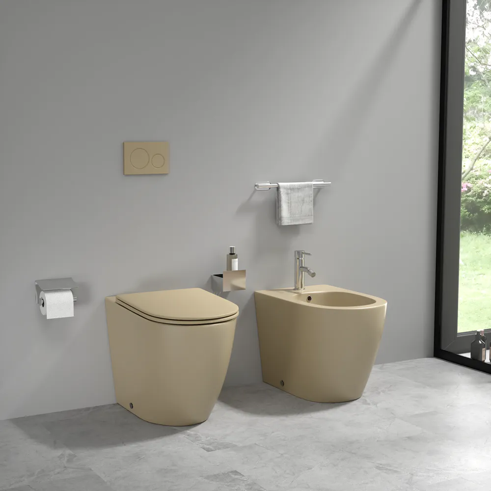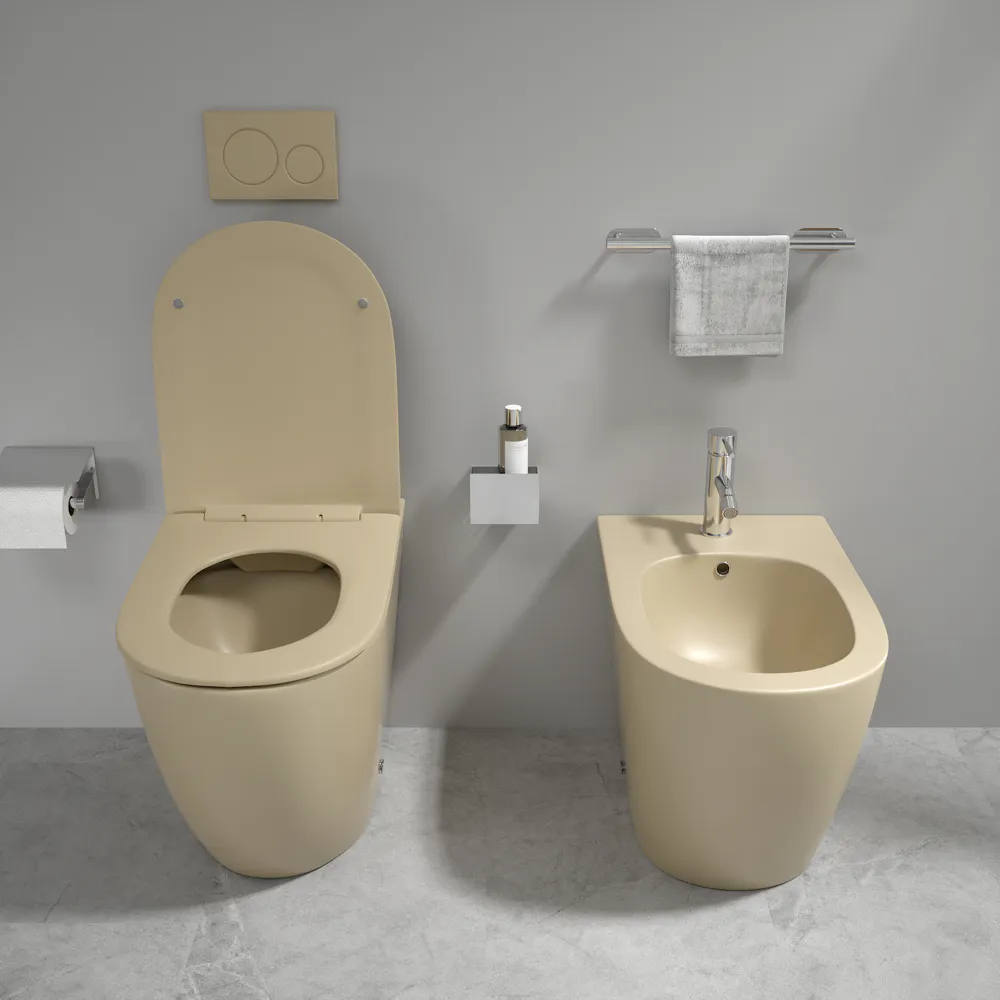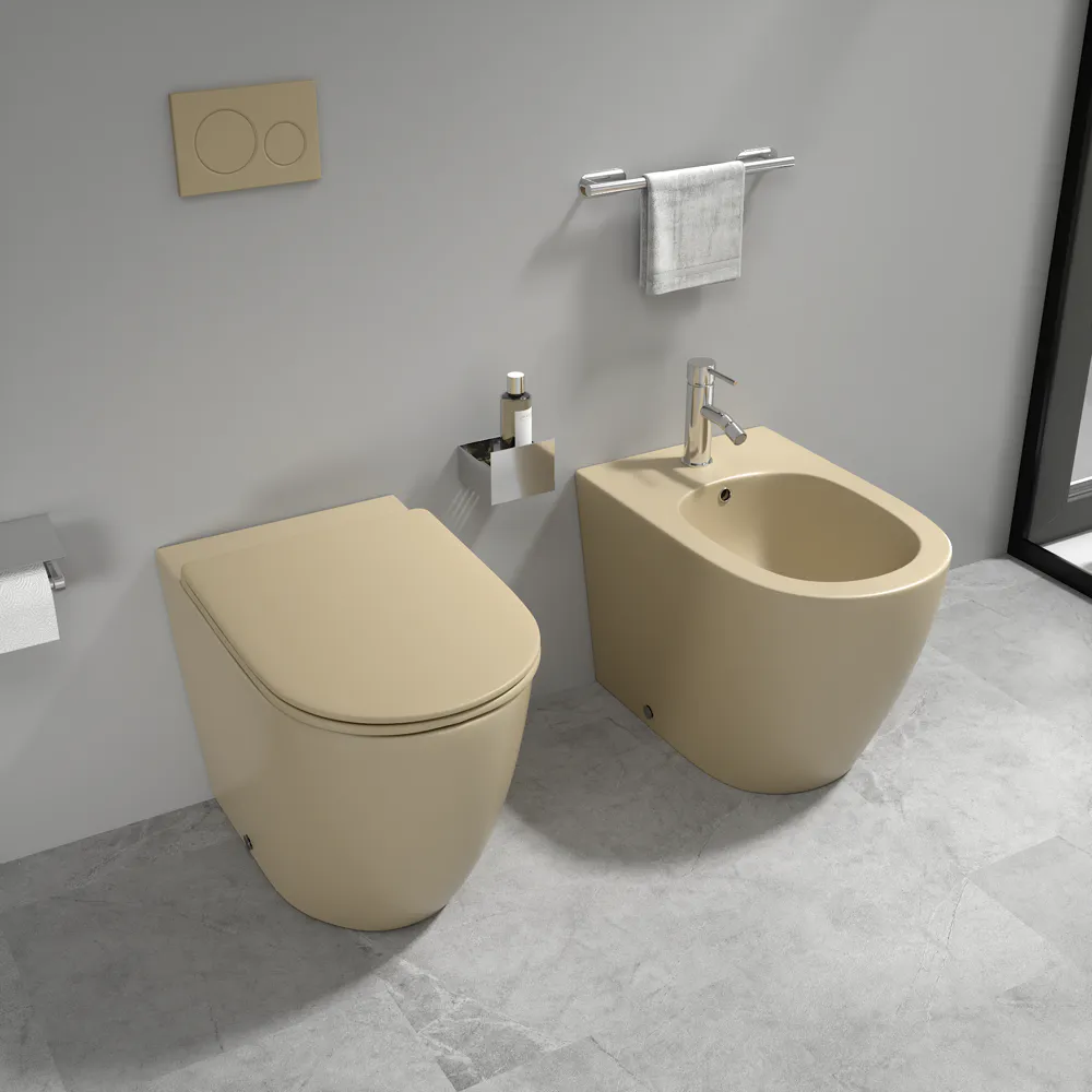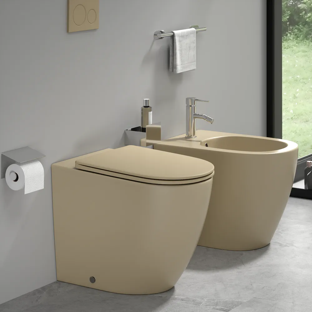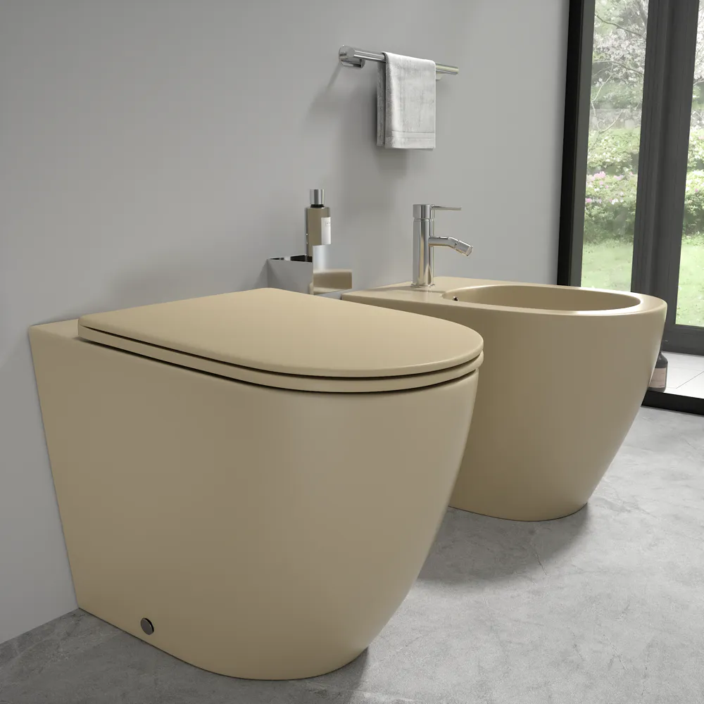 Sanitari filomuro in ceramica khaki opaco vaso rimless sedile soft-close e bidet | Europa