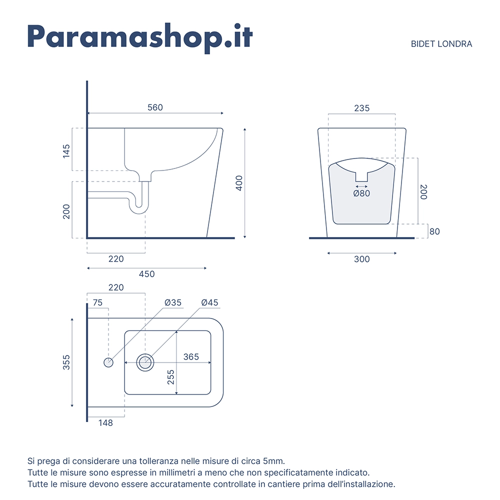 Si prega di notare che la curva tecnica, il sifone e la piletta di scarico per il bidet non sono inclusi ma possono essere acquistati separatamente nell'apposita sezione sul nostro store.