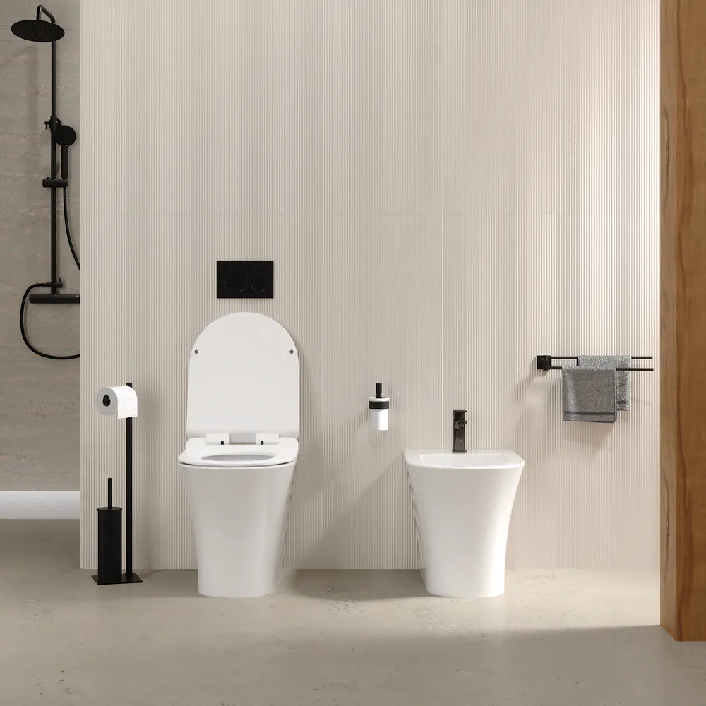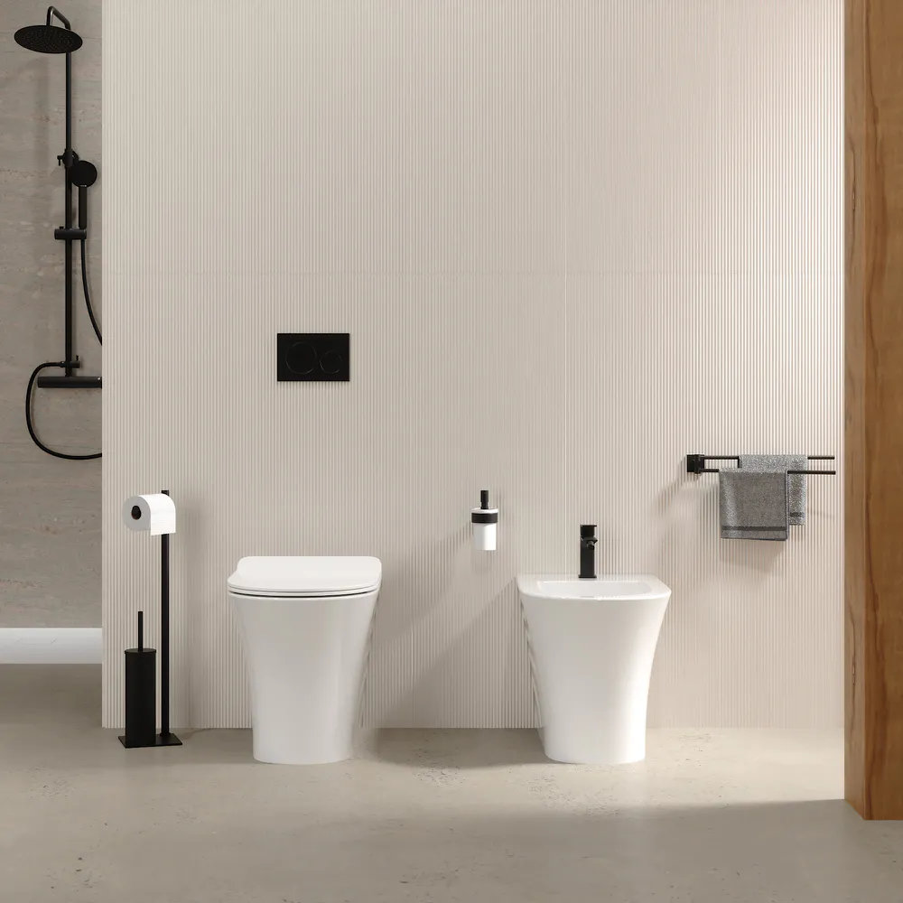 Il prodotto è composto da vaso WC filomuro, sedile soft-close e bidet. Per l'installazione con scarico a terra consigliamo di verificare la distanza dal muro e acquistare l'apposita curva tecnica presente nei prodotti correlati.