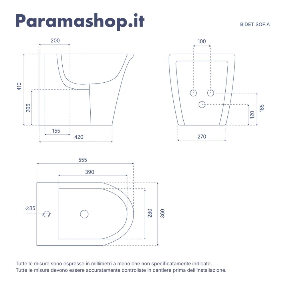 La linea Sofia di sanitari filomuro in ceramica si distingue per le sue linee eleganti ed il suo design facilmente abbinabile a qualsiasi tipo di bagno. Questa coppia di sanitari è composta da wc, bidet e sedile soft-close (chiusura rallentata). La caratteristica principale di questa serie è la sua praticità d'uso, difatti con una lunghezza/ingombro di 55,5cm i sanitari Sofia sono ideali per ogni tipologia di conformazione del bagno, offrendo una praticità d'uso senza precedenti.