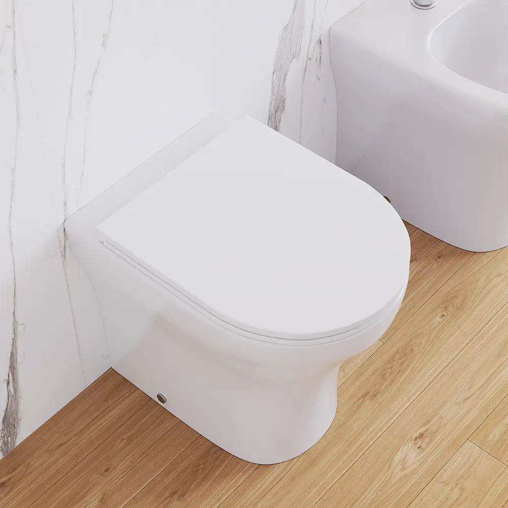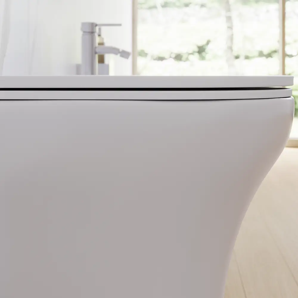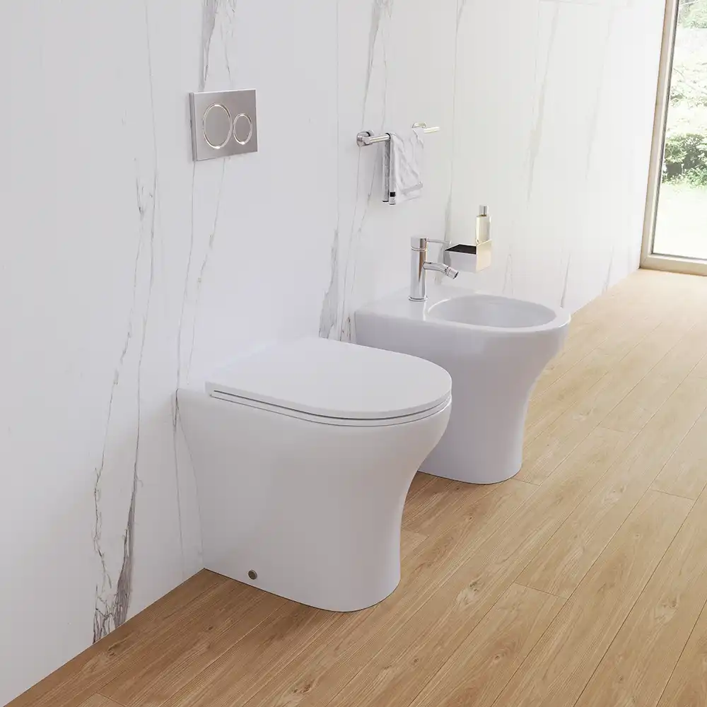 Sanitari filomuro rimless in ceramica bianco lucido: vaso bidet e copriwc soft-close | Nassau