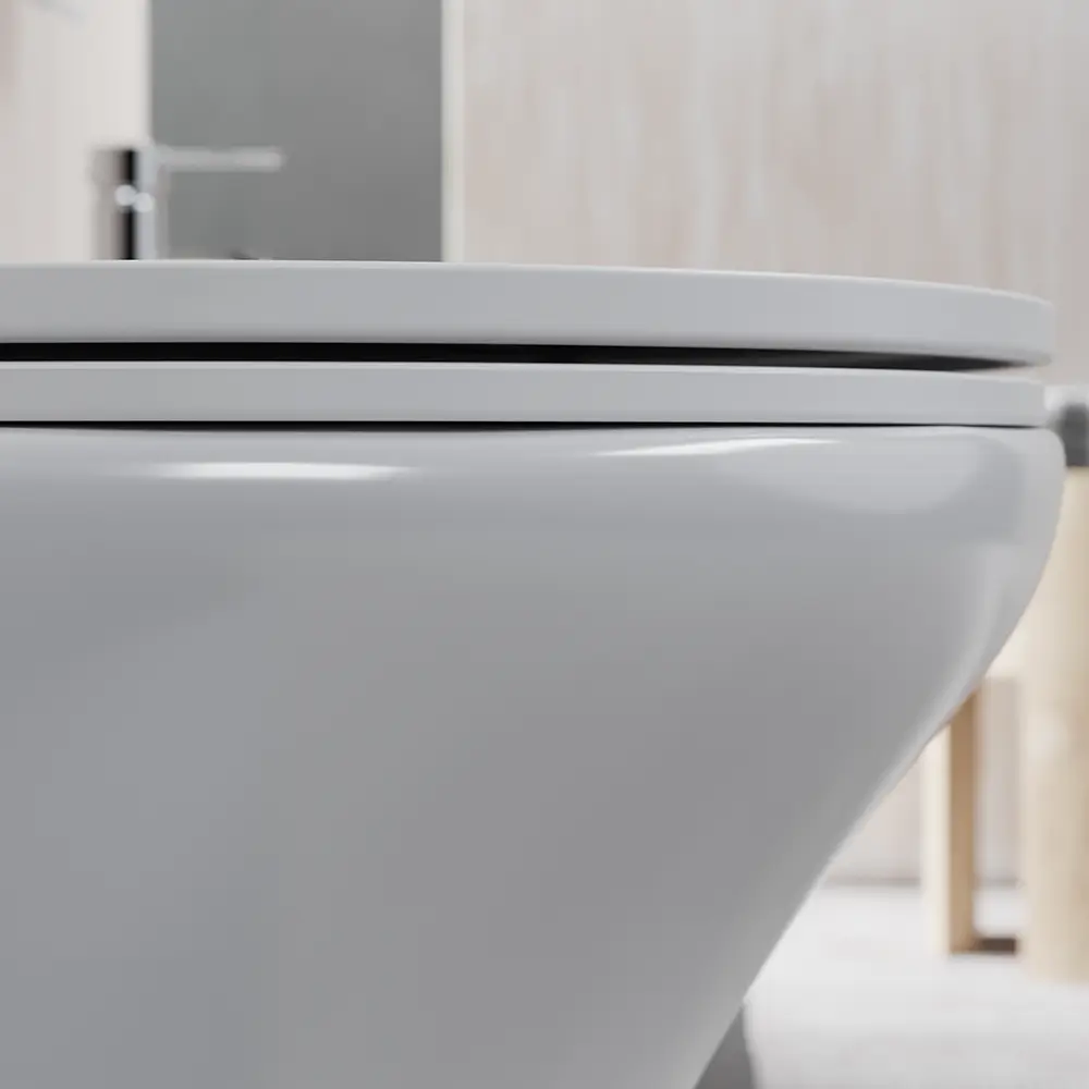 Il vaso è fornito con un pratico sedile a chiusura rallentata che offre un suo utilizzo delicato e senza fastidiosi rumori. Il copri-wc presenta inoltre un utilissimo tasto per lo sgancio rapido.