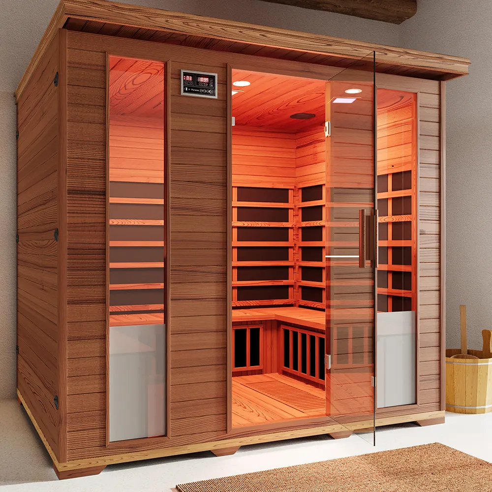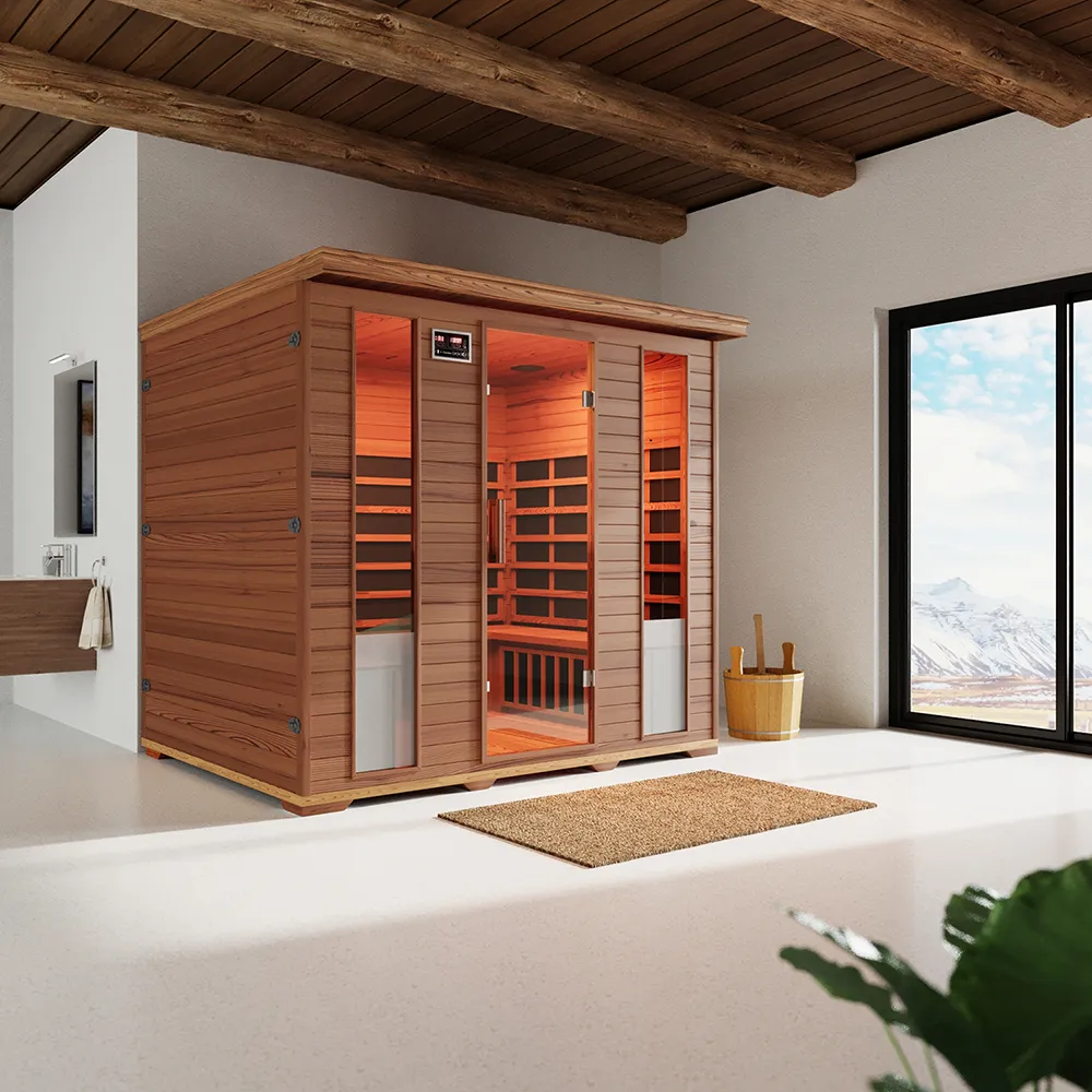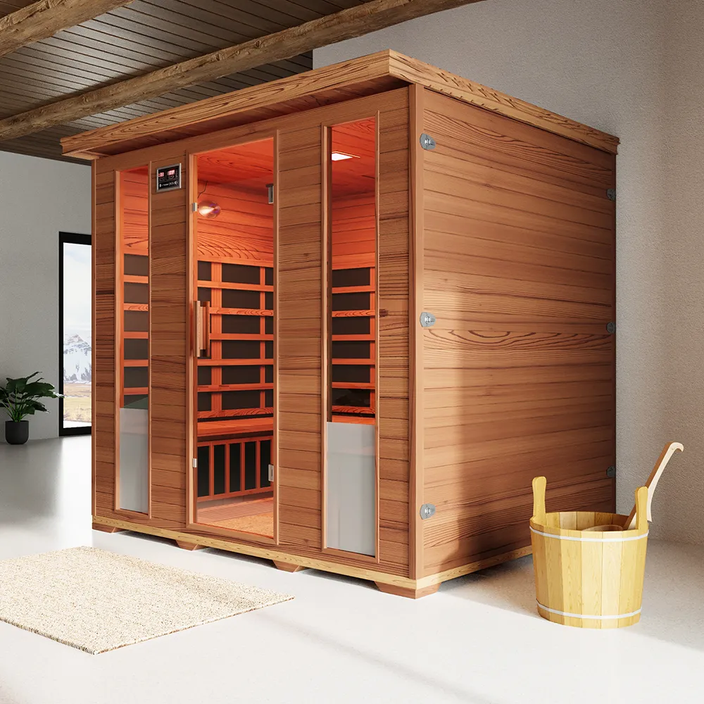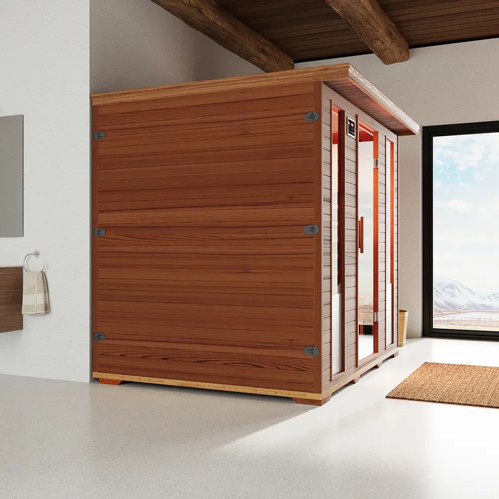 Esplora il massimo del comfort e del lusso con la nostra Sauna ad infrarossi Porvoo, un'opera d'arte di benessere in legno di cedro dalle dimensioni generose. Con una spaziosa area interna di 160x210 cm e un'altezza di 195 cm, questa sauna offre un'esperienza di relax senza pari nel cuore della tua casa.