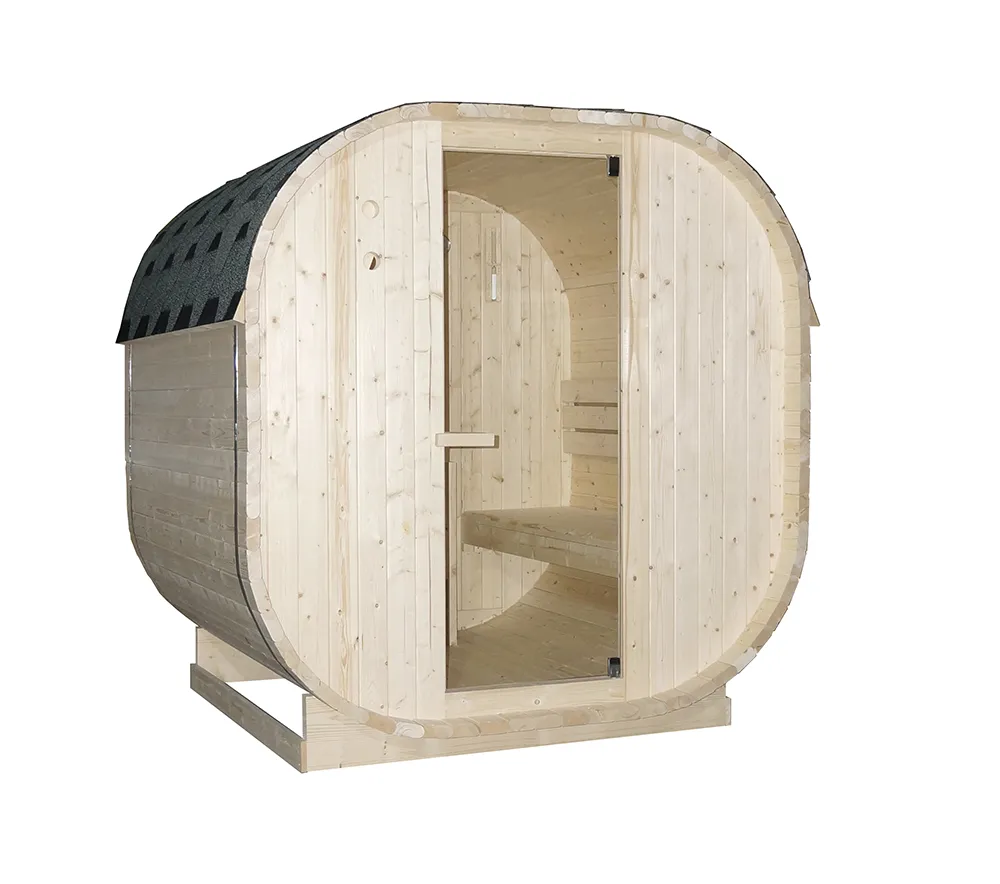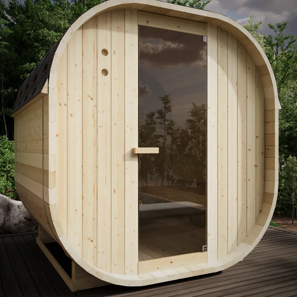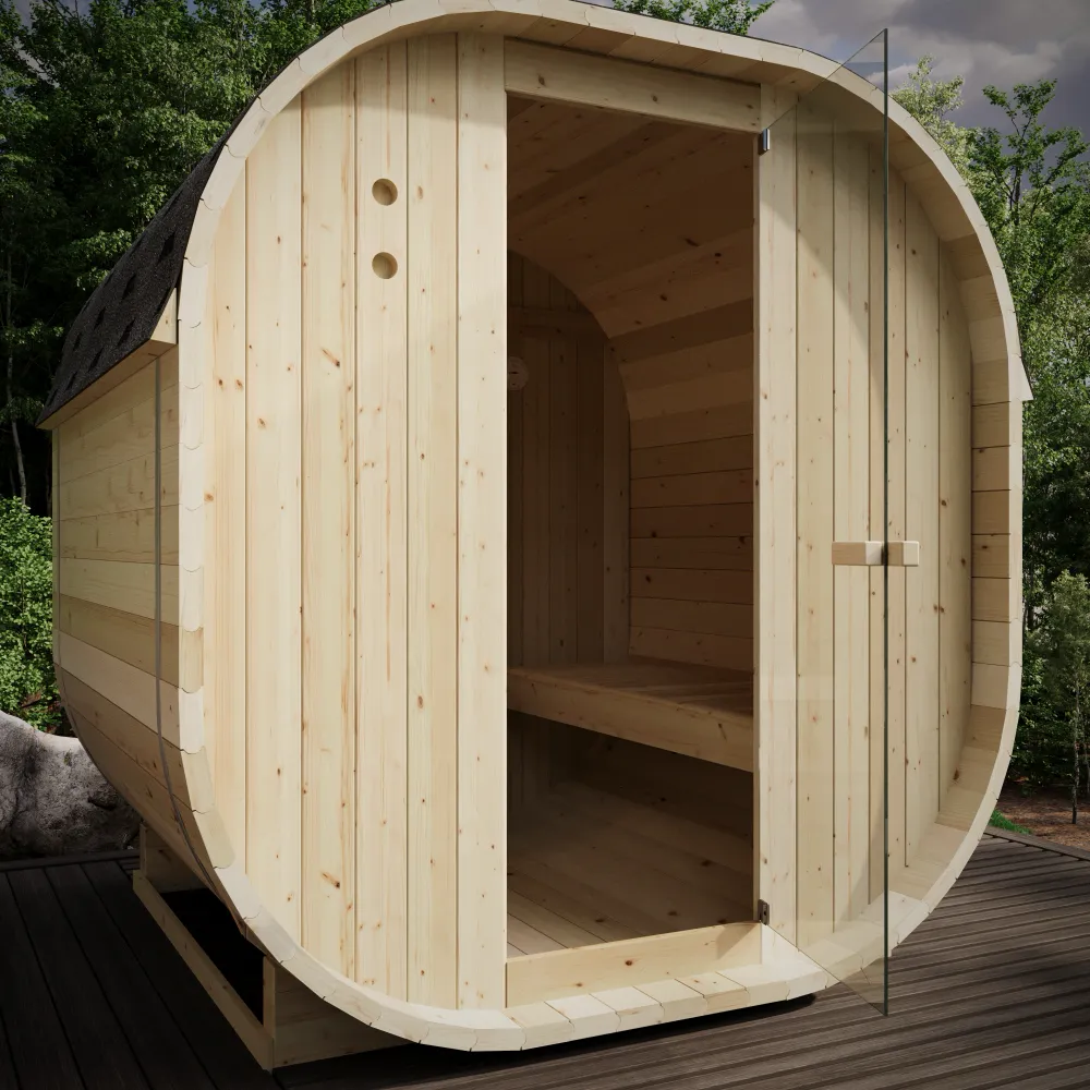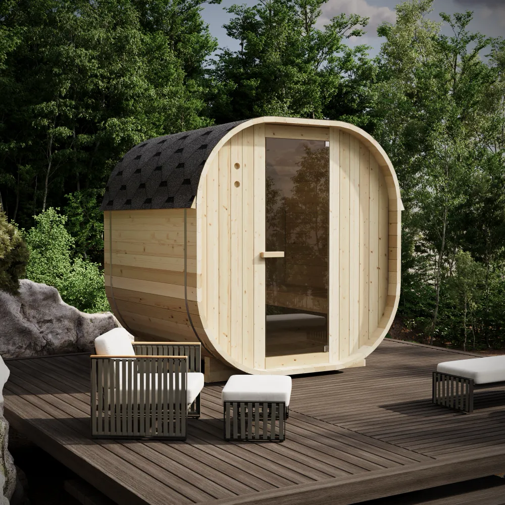 Per un’esperienza completa, la sauna viene fornita con tutti gli accessori essenziali: un secchio per sauna, una spatola in legno, un termometro e una clessidra. Le tegole del tetto sono già incluse nella confezione, offrendo una protezione efficace dagli agenti atmosferici e migliorando la durabilità della struttura all’esterno.