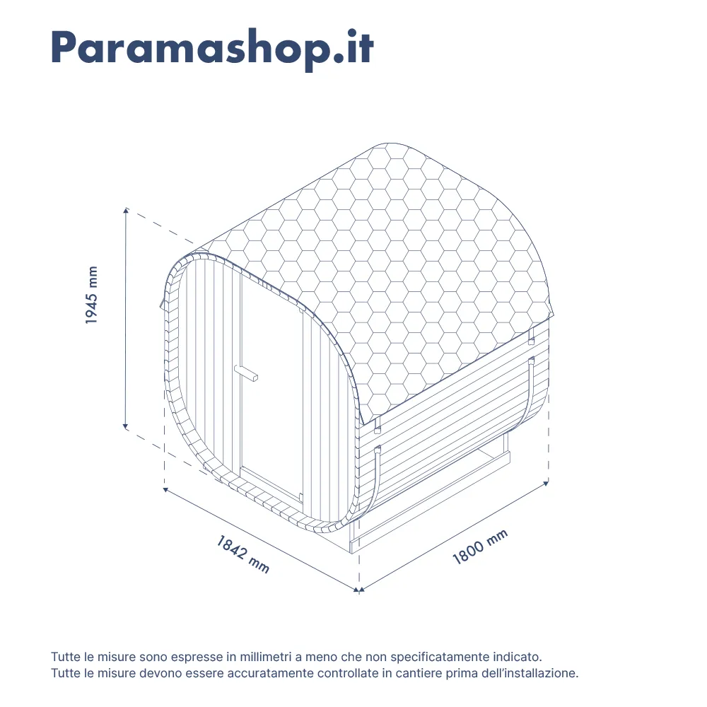 Questa elegante sauna finlandese da esterno offre un perfetto equilibrio tra funzionalità, comfort e estetica. Realizzata in legno di abete rosso non trattato, è ideale per trasformare il tuo spazio esterno in un angolo di puro relax. Le dimensioni esterne sono di 184,2 x 181,7 x 194 cm, mentre lo spazio interno misura 160 x 153,8 x 162 cm, garantendo un ambiente accogliente per più persone.