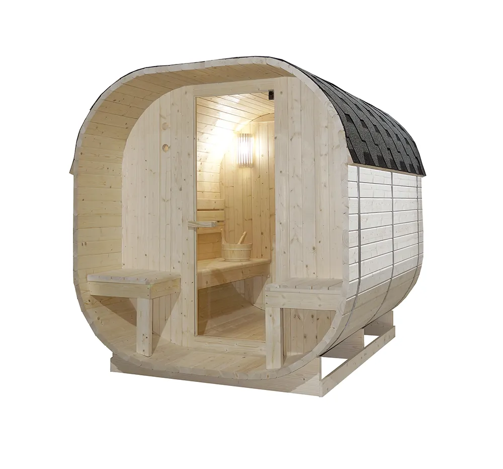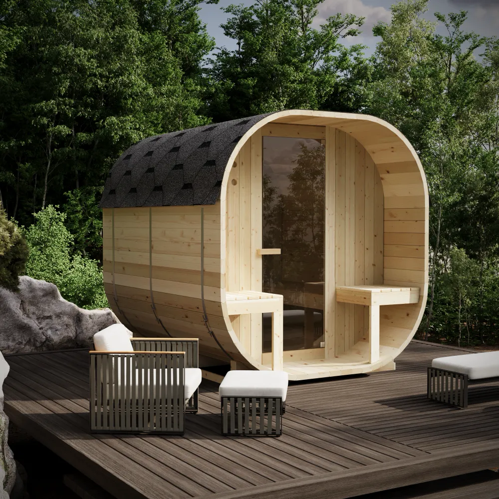 Per un’esperienza completa, la sauna viene fornita con tutti gli accessori essenziali: un secchio per sauna, una spatola in legno, un termometro e una clessidra. Le tegole del tetto sono già incluse nella confezione, offrendo una protezione efficace dagli agenti atmosferici e migliorando la durabilità della struttura all’esterno.