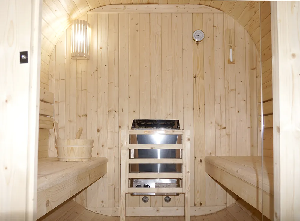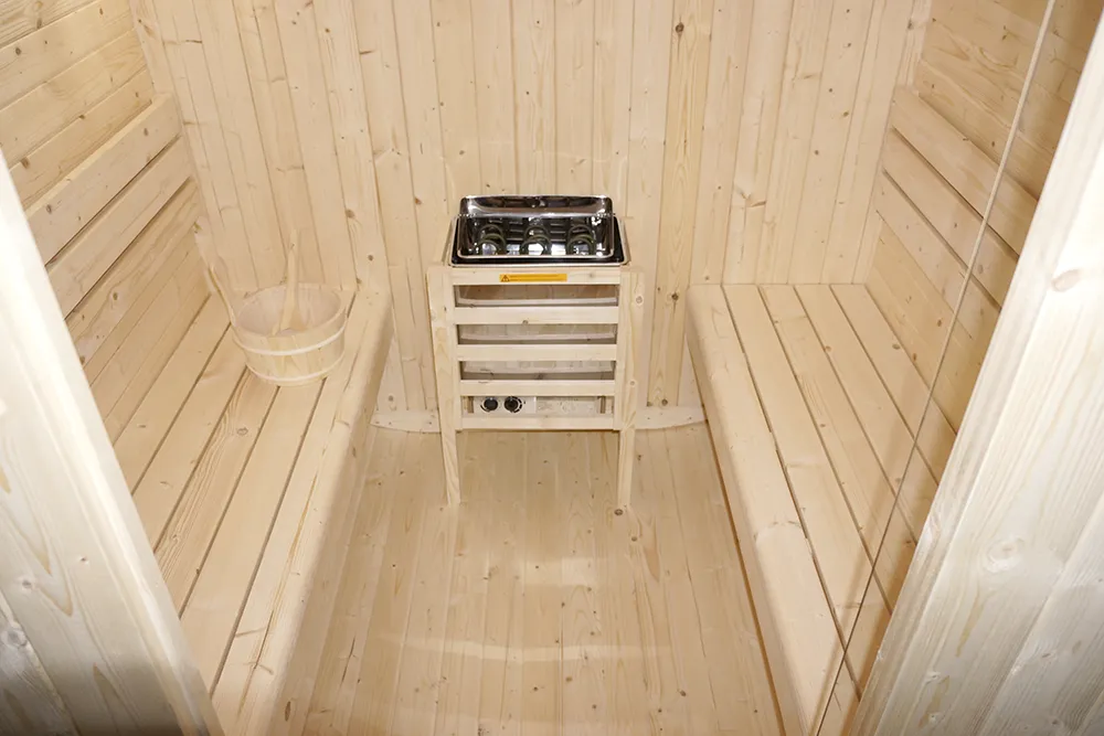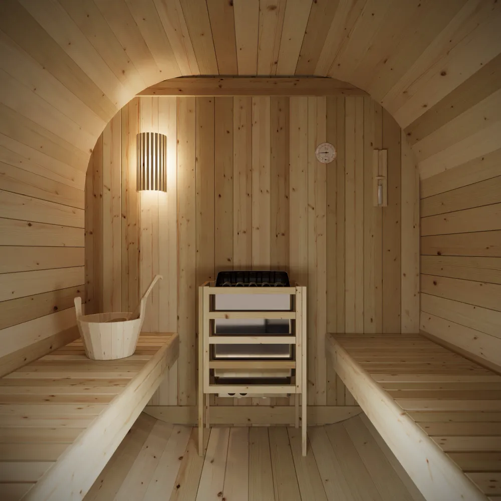 Il cuore della sauna è la sua stufa elettrica da 8 kW. Capace di raggiungere una temperatura massima compresa tra 80°C e 100°C, permette di godere appieno dei benefici del calore secco tipico della tradizione finlandese. La potenza elevata consente un riscaldamento rapido ed efficiente dello spazio interno.