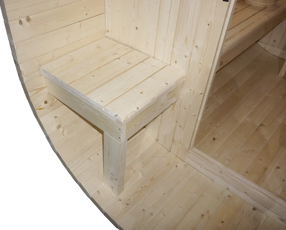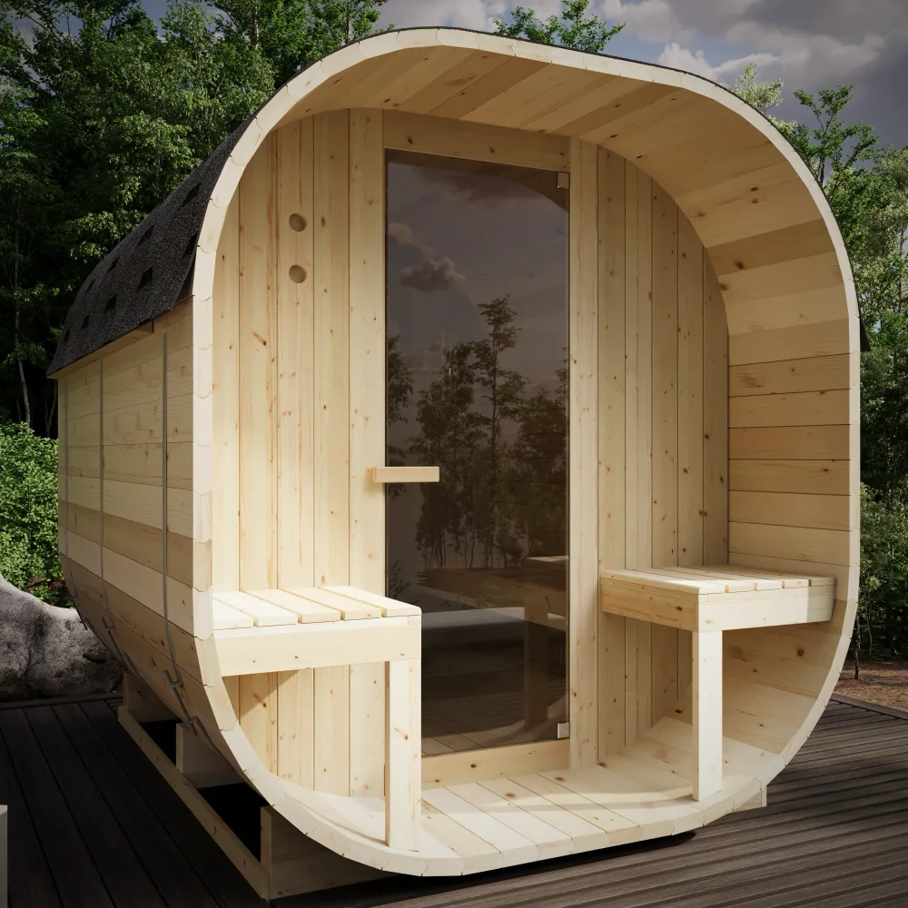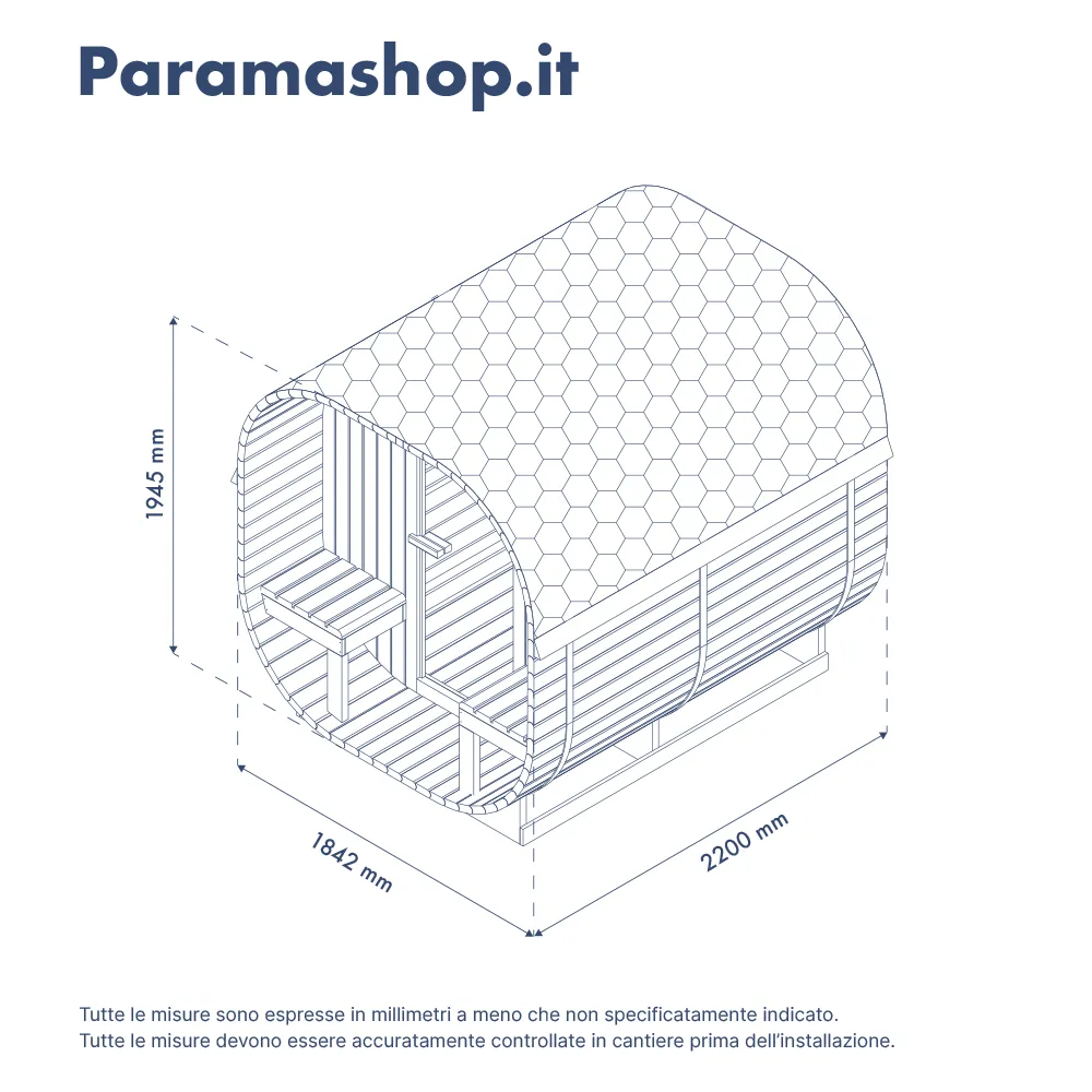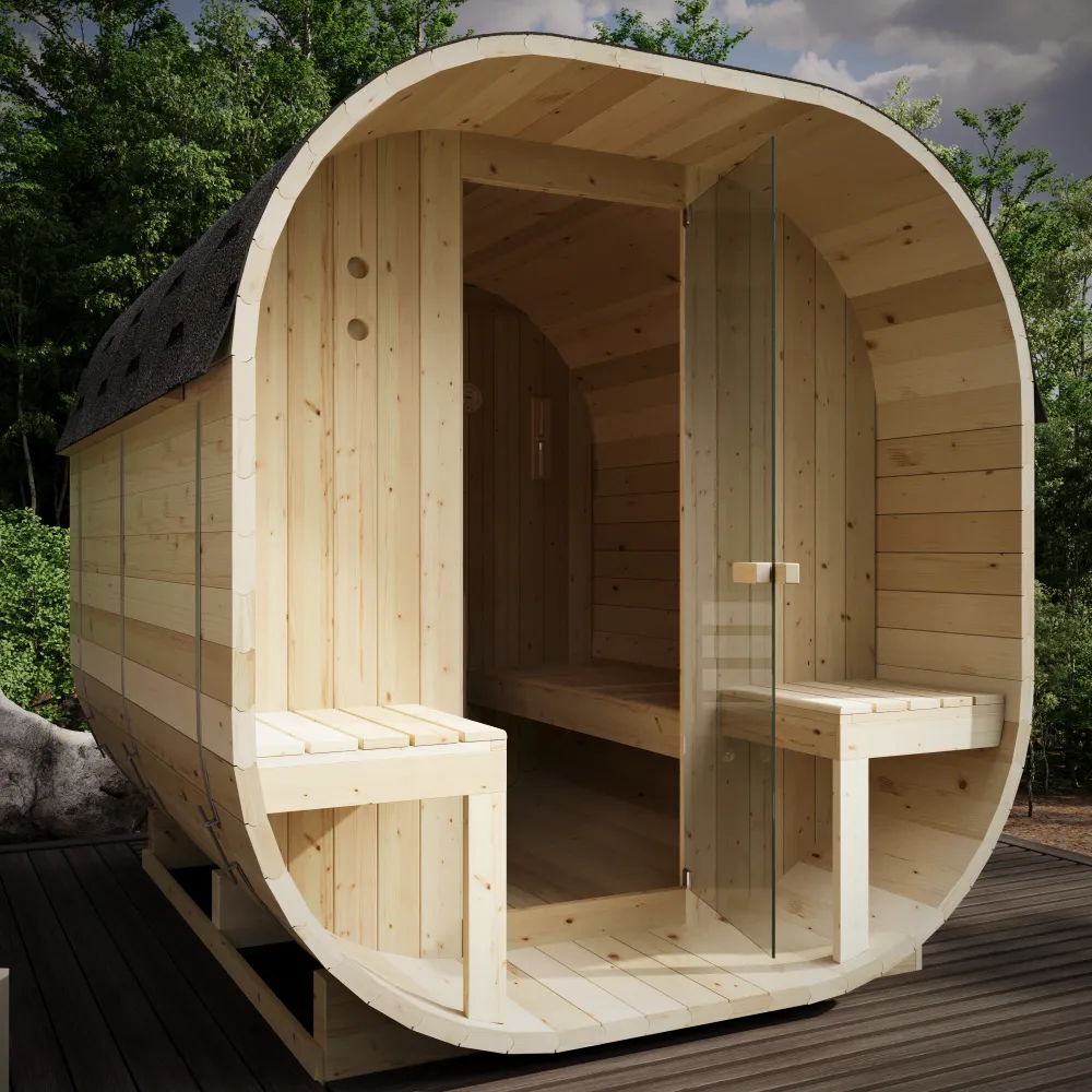 Il legno di abete rosso utilizzato è resistente alla putrefazione e offre una straordinaria stabilità dimensionale. Le pareti hanno uno spessore di 3,8 cm, assicurando un eccellente isolamento termico. Il sedile interno misura circa 50 x 193,8 cm, con un'altezza di 45 cm, offrendo comodità durante ogni sessione.