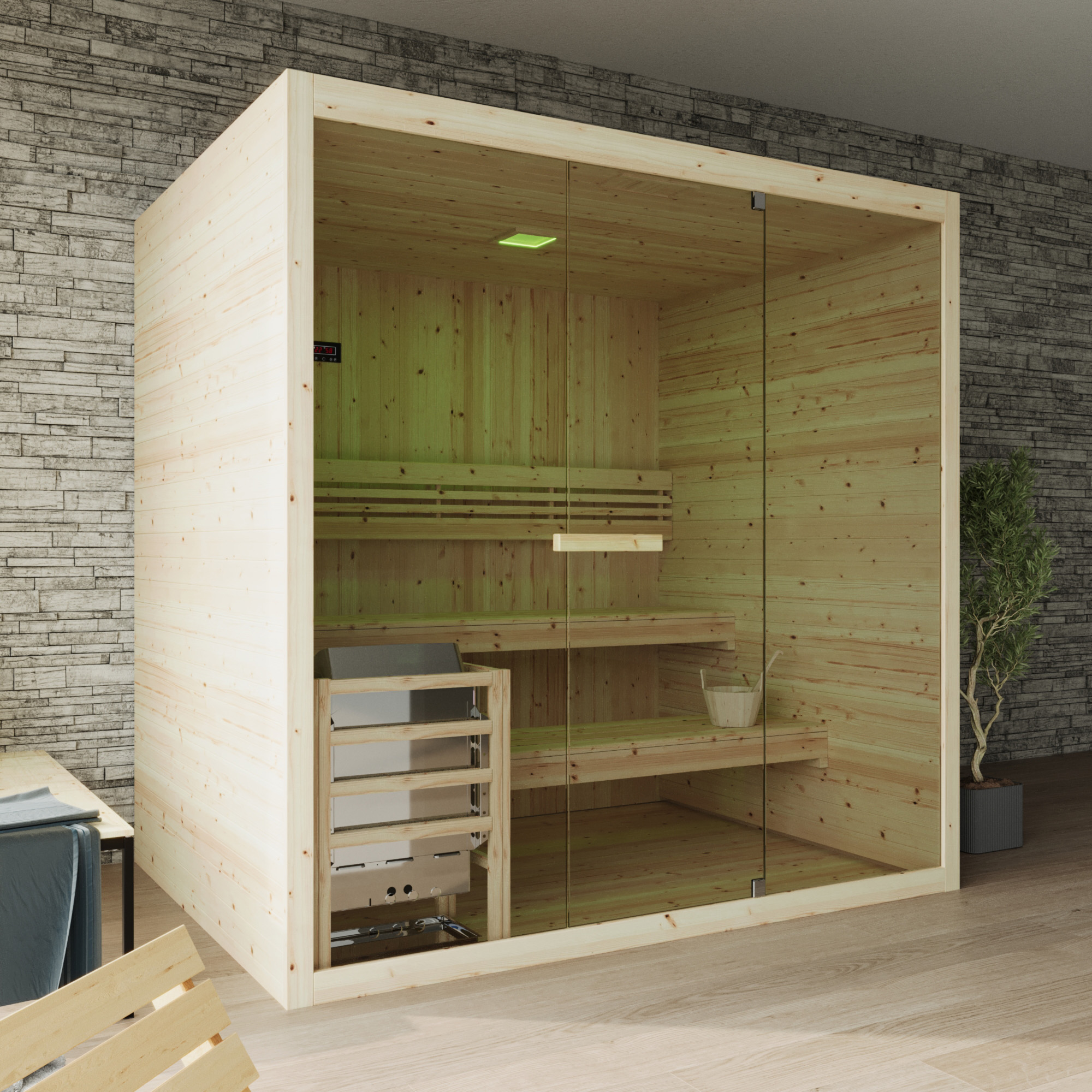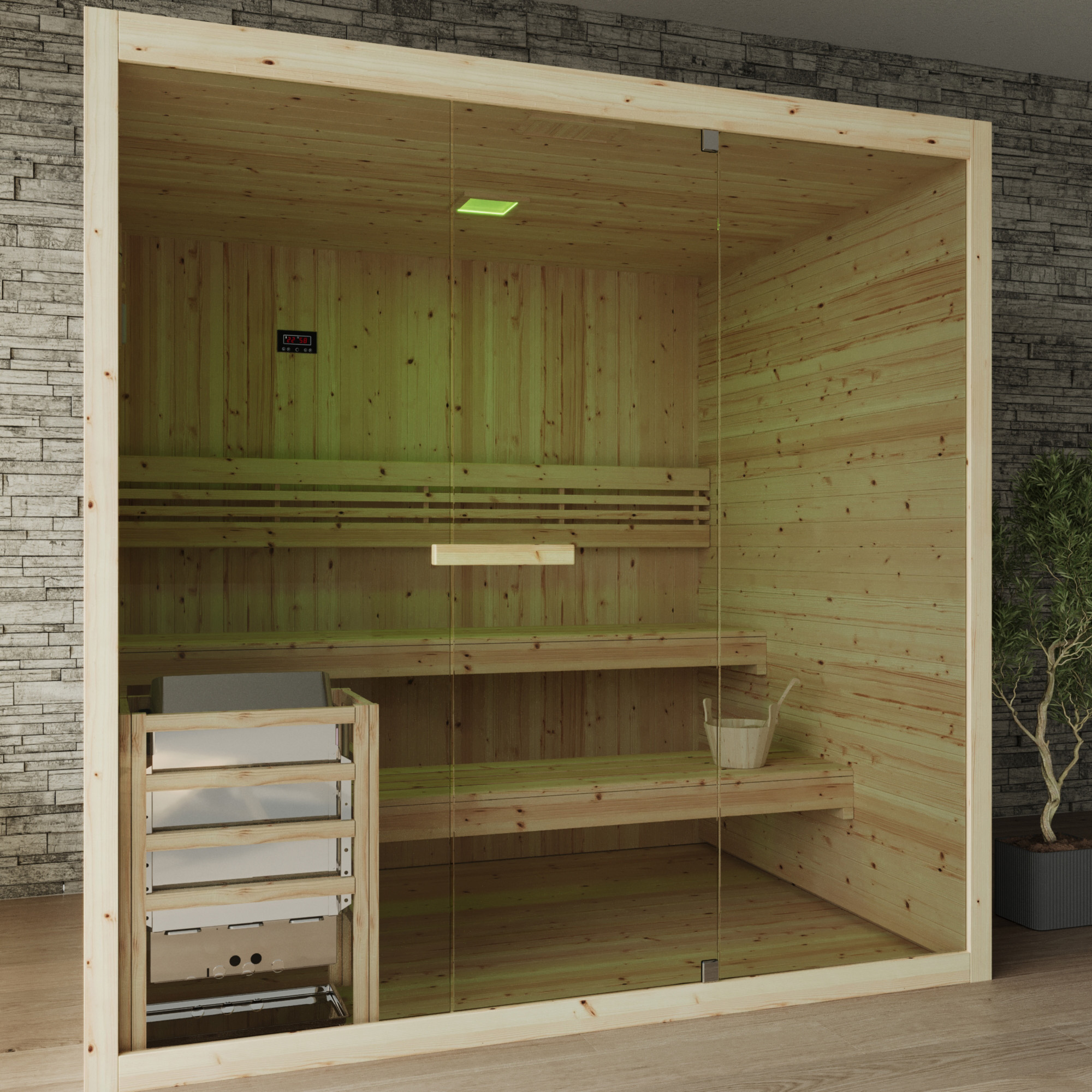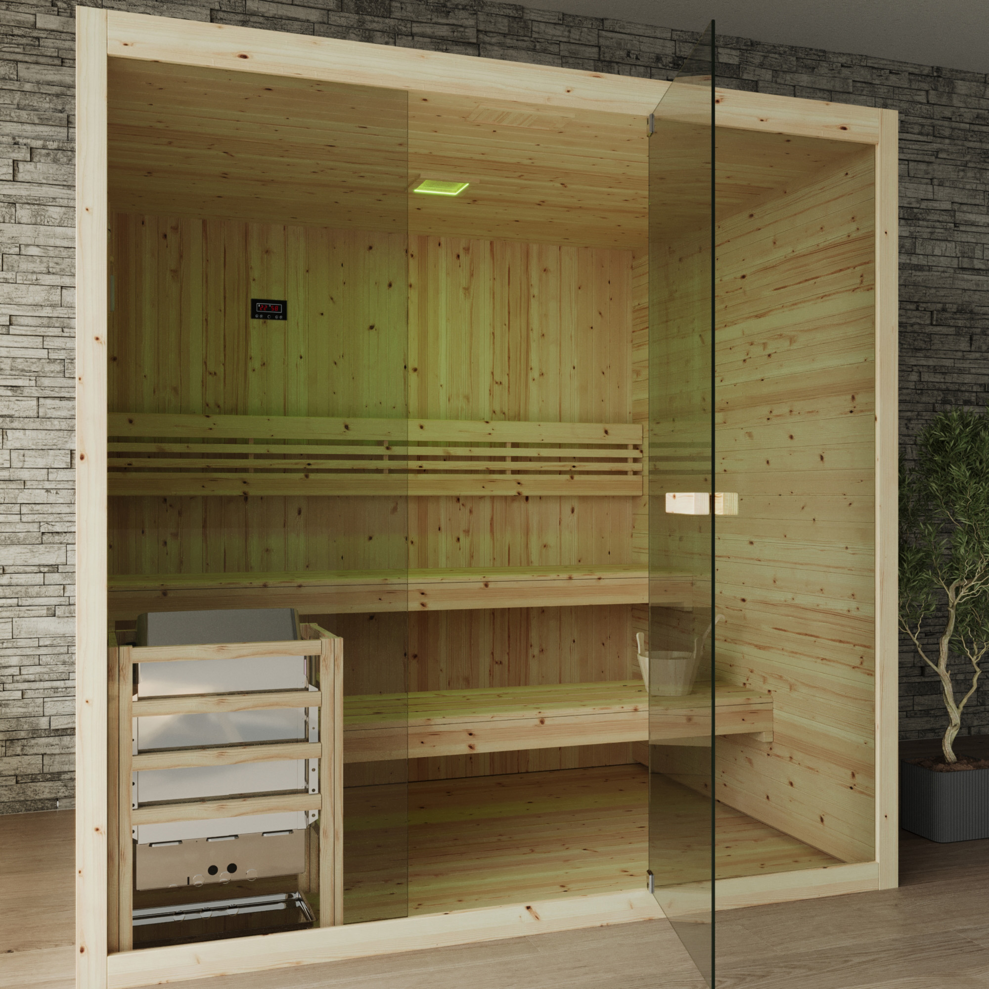 All’interno, la sauna è dotata di due panche disposte su diversi livelli e di un pratico poggiaschiena, pensati per garantire una seduta confortevole. La stufa elettrica da 8 kW, con comandi integrati, è protetta da una griglia di sicurezza e viene fornita con pietre per la produzione del tradizionale vapore caldo.